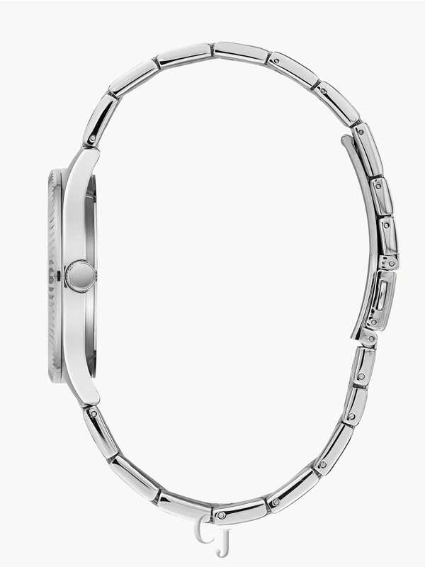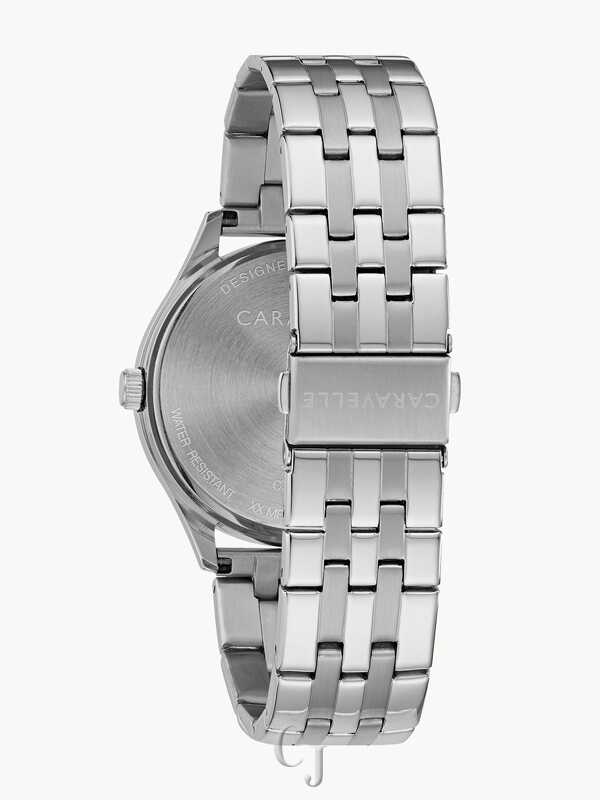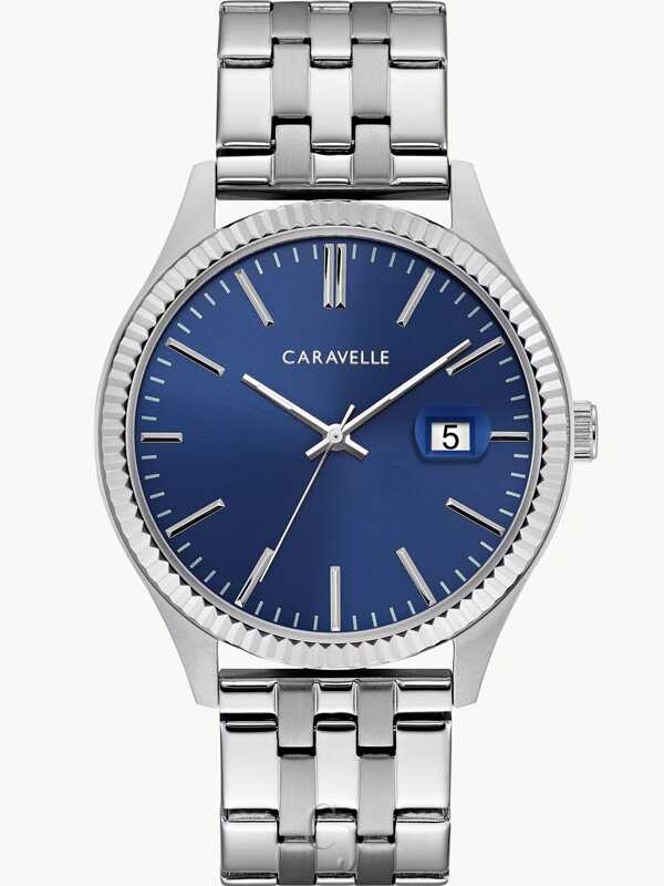 Elegant and perfectly refined describe this graphic dark blue dial, three-hand stainless steel watch. Featuring a textured bezel detail, date magnifier and stainless steel bracelet with double-press fold-over closure.