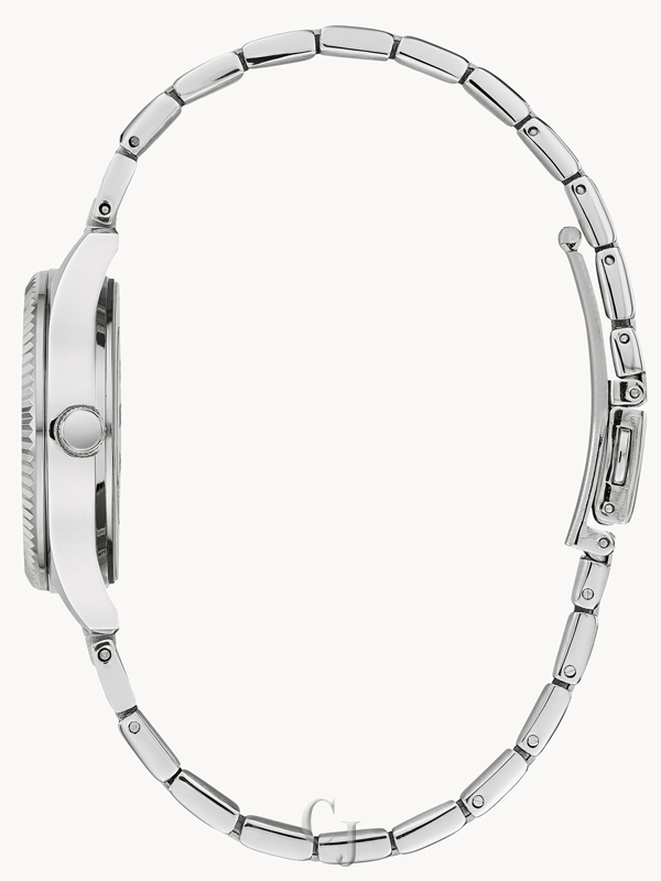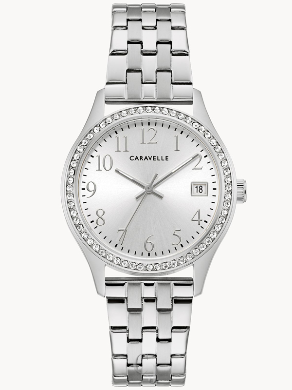Add sparkle to your style with this Classic collection gift set. The timepiece includes a white sunray dial with a calendar window at 3 o’clock, a silver-tone stainless steel case with 60 crystals on the bezel, and a polished silver-tone stainless steel bracelet. A silver-tone stainless steel jewelry bracelet completes the gift set with 56 crystals set on the center plate and a lobster claw closure.
