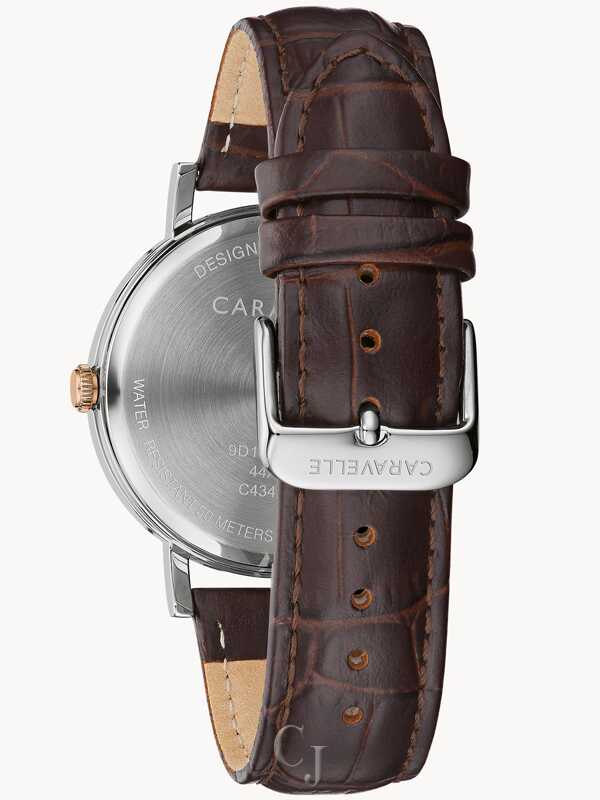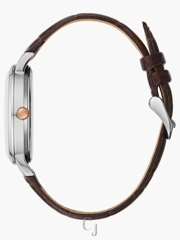 Retro style with modern edge. Stainless steel case with a silver white dial and a touch of rose gold-tone for extra flair. Brown leather strap with crocodile pattern. Domed mineral crystal. Three-piece wire closure.