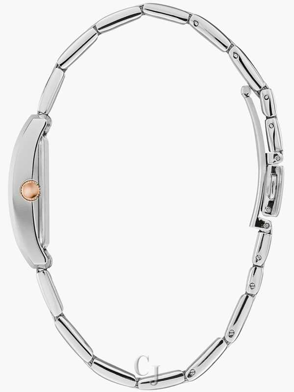 An everyday essential that can be dressed up or down. Sophisticated stainless steel case with a two-tone rose gold-tone dial and bracelet. Metalized curved mineral crystal. Short foldover clasp closure.
