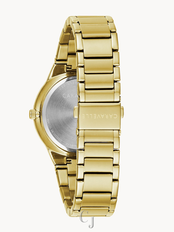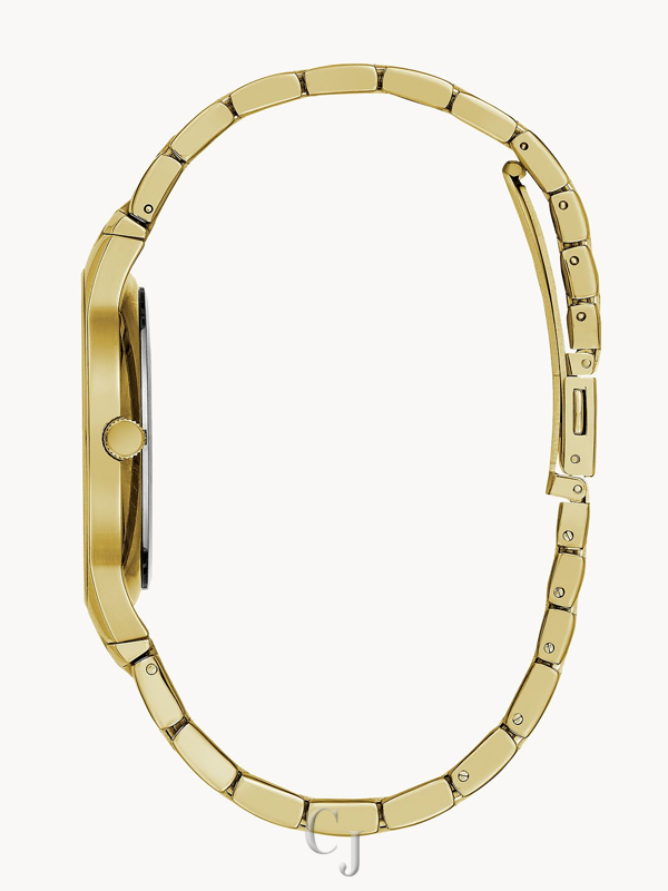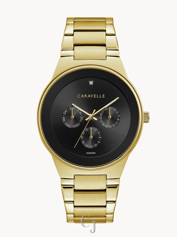 The modern way to multitask. A single diamond at 12 o’clock accents a jet black dial with luminous hands and multifunction movement with day, date and 24-hour sub dials, as well as edge-to-edge metalized crystal. Gold-tone stainless steel case and bracelet with double-push fold-over closure.