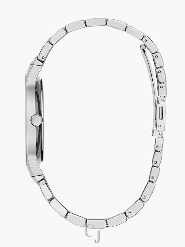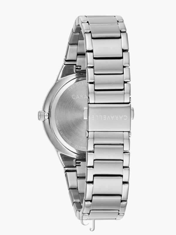 The modern way to multitask. A single diamond at 12 o’clock accents a midnight blue dial with luminous hands and multifunction movement with day, date and 24-hour sub dials, and edge-to-edge metalized crystal. Stainless steel case and bracelet with double-push fold-over closure.