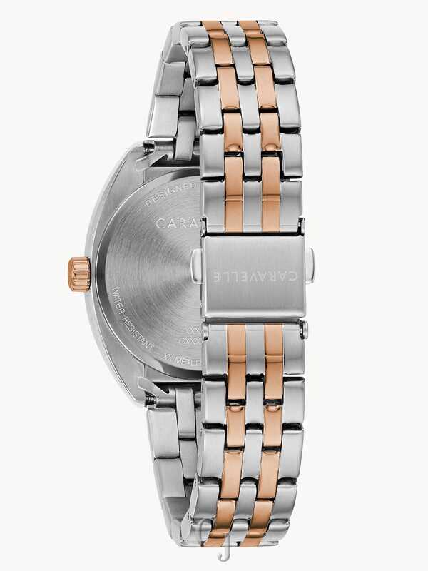 Retro-style, modern glamour! 80 brilliant crystals embellish a silver-white sunray dial and saddle-shaped two-tone rose gold and stainless steel case and bracelet with double-push fold-over closure.