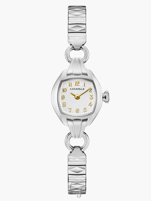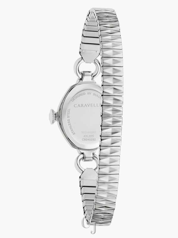 A celebration of classic style, the ladies’ Caravelle Cocktail watch brings Golden Age charm to your wrist. A unique stainless steel case reclaims the sophistication of a bygone era of uncompromising sophistication. The textured dial and its gold-tone hands and numerals evoke a timeless aesthetic, while the stainless steel textured expansion bracelet serves as the perfect complement. Now that you’ve found your new favorite watch in the women’s Caravelle Cocktail, what else will you do?