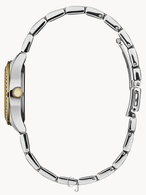 For all-day dazzle and petite perfection, this updated boyfriend design sparkles with 48 brilliant crystals. In stainless steel with two-tone yellow-gold and silver finish, patterned silver-white sunray dial, calendar, and double-press fold-over clasp.