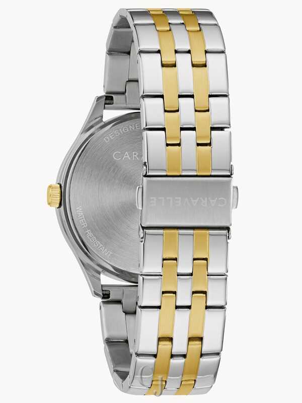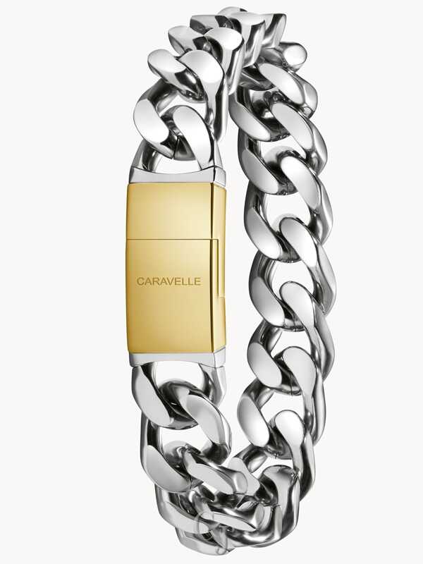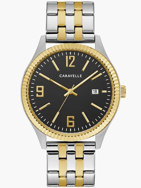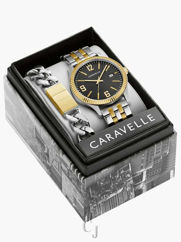 Elegant and perfect defines this gift set from the Dress collection. The timepiece includes a black sunray dial with a calendar window at 3 o’clock, a gold-tone coin edge bezel, and a polished two-tone stainless steel bracelet. A silver-tone stainless steel jewelry bracelet completes the gift set with a heavy curb chain design and a gold-tone magnetic closure.