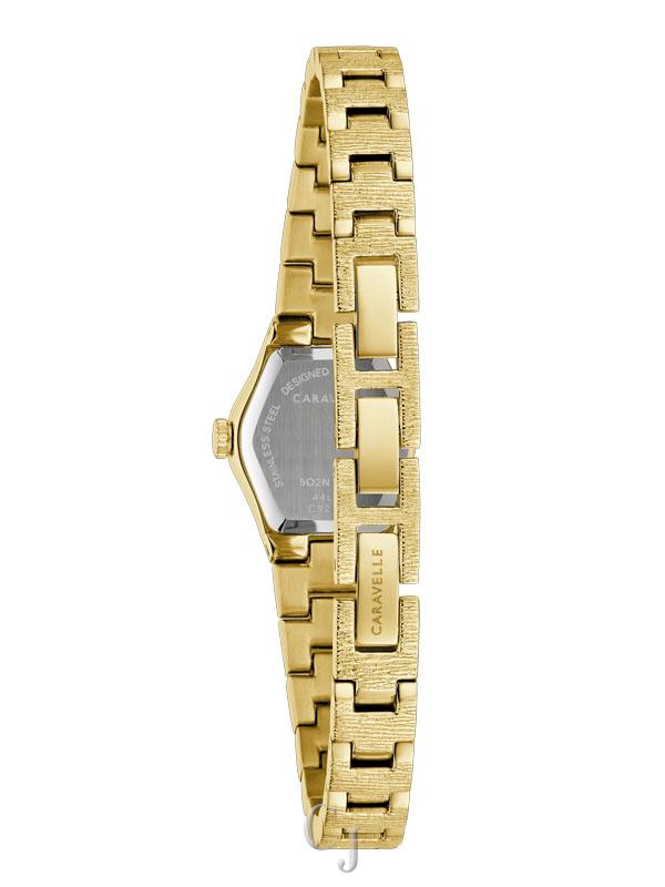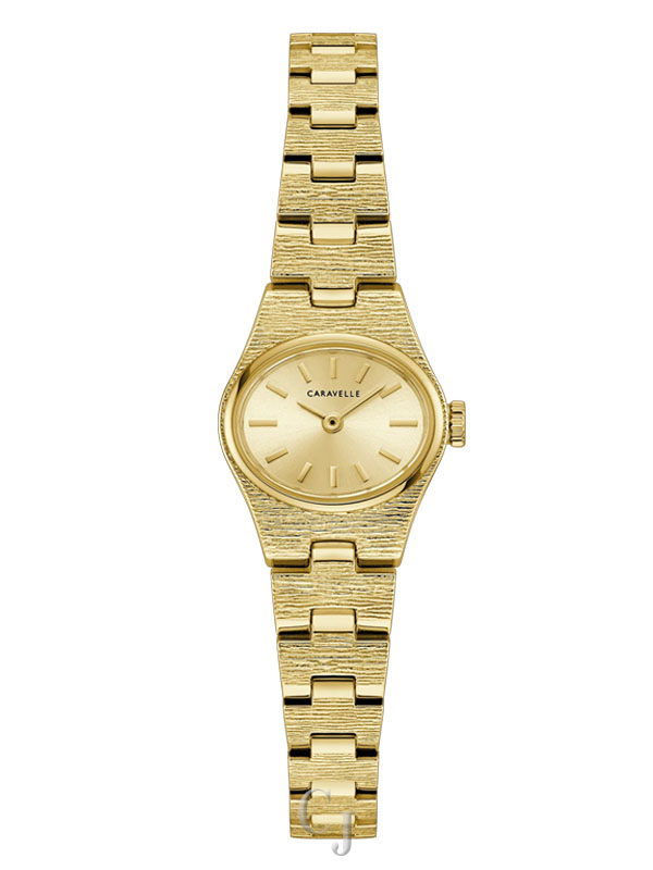 Brought to life with a brilliant textured case, this vintage-inspired Caravelle ladies’ timepiece is as glamorous as it is stylish. This incredible wristwatch begins with a sleek, brightly polished gold-tone stainless steel integrated bracelet and case, which are both given a distinctive texture that echoes vintage Caravelle designs. With a striking sunray finish, the champagne dial is appointed with applied hour markers and a polished gold-tone handset. Embrace a new style with this Caravelle ladies’ watch.