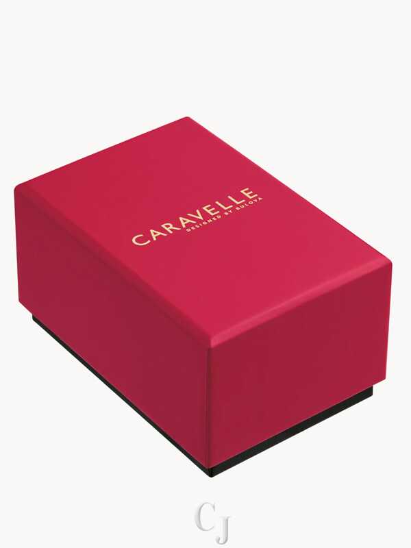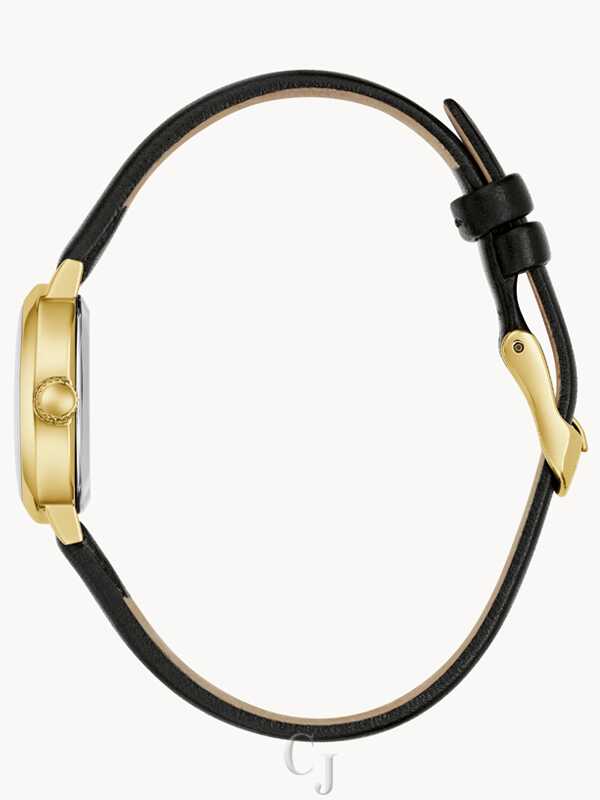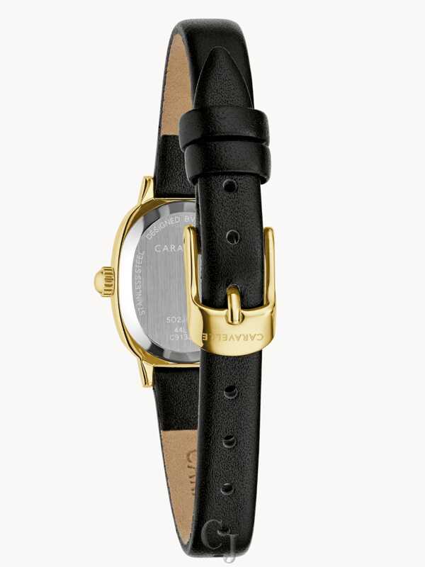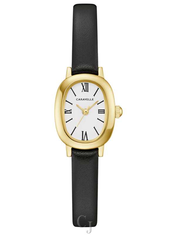 Understated and eminently wearable, this Caravelle ladies’ timepiece is your new go-to. Fully polished, the petite oval case is crafted from gold-tone stainless steel, delivering uncompromised elegance, while the slim black leather strap ensures the watch carries perfectly on the wrist. A refined white dial is printed with Roman numerals and slender markers while the time is traced by a gold-tone handset. Achieve an effortless and sophisticated charm with this beautiful Caravelle ladies’ watch.