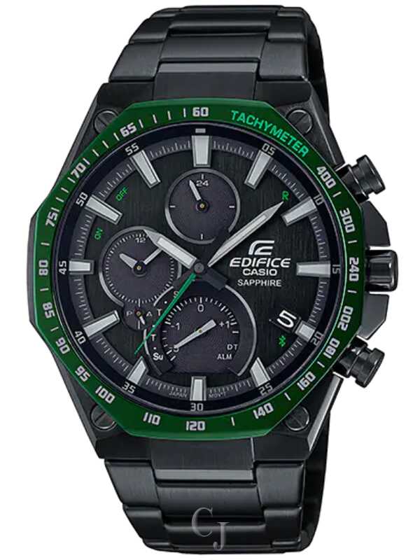 Smartphone Link | Super Slim High Spec Chronograph | Solar powered | Despite being a high-spec multi-hand chronograph with a smartphone link via Bluetooth® and being equipped with Tough Solar, which charges even in low light, this model achieves both high functionality and wearability via a thin 8.9 mm case. It enables functions such as world time, which controls and corrects time via a dedicated smartphone app that is able to select times for approximately 300 cities, and a special stopwatch function that comes in handy while watching races. The EQB-1100X series uses a tachometer mounted on an octagonal bezel. This gives models in this series a sportier design. A scratch-resistant sapphire crystal with an anti-reflective coating ensures high visibility. The bezel is green ion plated and the case and band are black ion plated to make them scratch resistant.