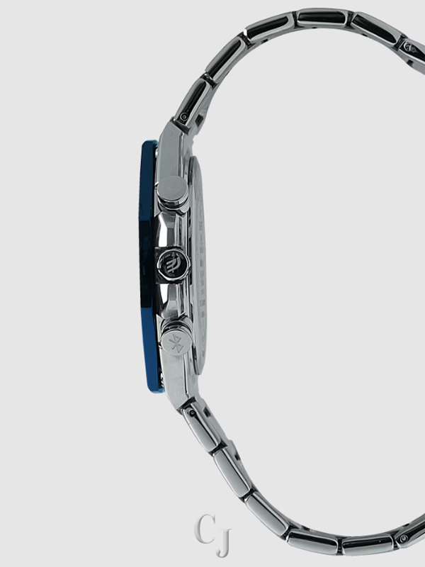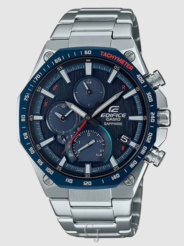 Smartphone Link | Super Slim High Spec Chronograph | Solar powered | Despite being a high-spec multi-hand chronograph with a smartphone link via Bluetooth® and being equipped with Tough Solar, which charges even in low light, this model achieves both high functionality and wearability via a thin 8.9 mm case. It enables functions such as world time, which controls and corrects time via a dedicated smartphone app that is able to select times for approximately 300 cities, and a special stopwatch function that comes in handy while watching races. The EQB-1100X series uses a tachometer mounted on an octagonal bezel. This gives models in this series a sportier design. A scratch-resistant sapphire crystal with an anti-reflective coating ensures high visibility.