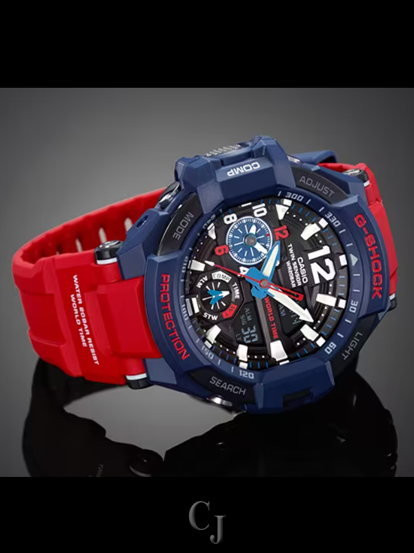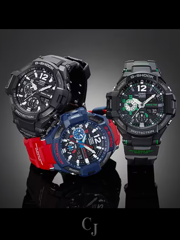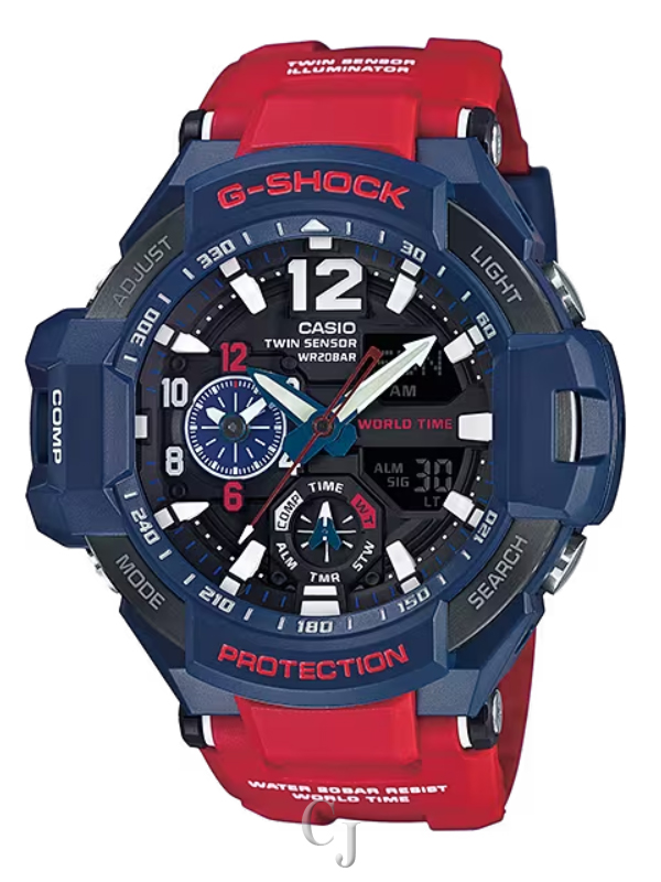 This is a model from the G-Shock Gravitymaster Series for pilots who work in harsh conditions. It comes with an advanced World Time feature. It is an aviation watch for pilots who require different kinds of information and need to be able to display and check time information for a different time zone. The visibility of the home time has been improved through the use of broad hour and minute hands, while the local time is displayed in 12-hour format on the subdial, allowing you to check the current time in two cities at once. It also comes with a compass and temperature sensor and allows for continuous Compass and Temperature Measurement over 60-second periods. The high-luminance LED lighting also allows you to check the time and other information in the dark. The toughness and diverse range of functions have allowed the Gravitymaster to evolve in leaps and bounds as an aviation watch.