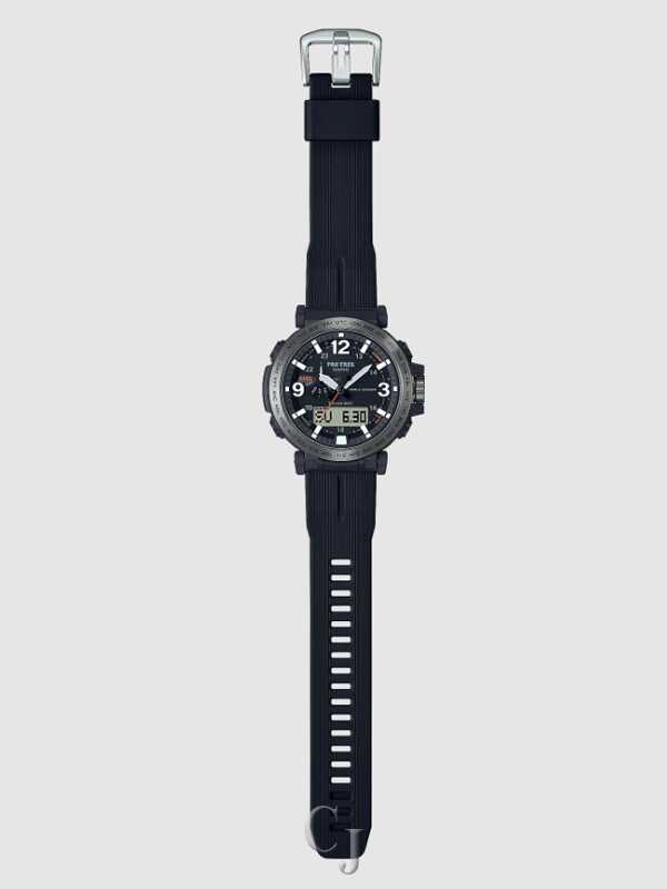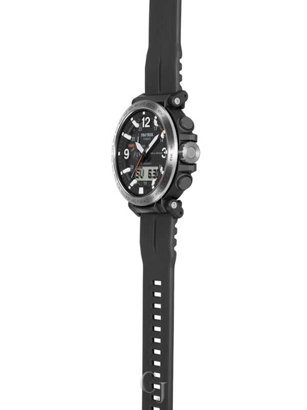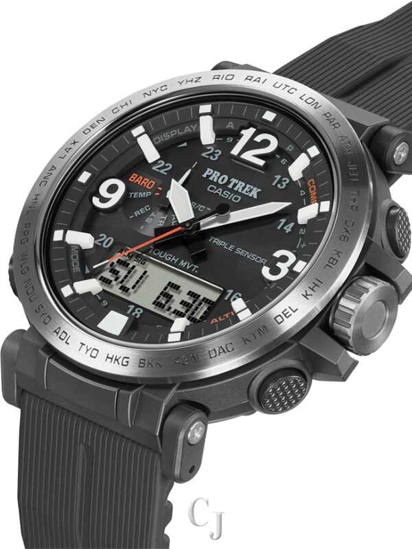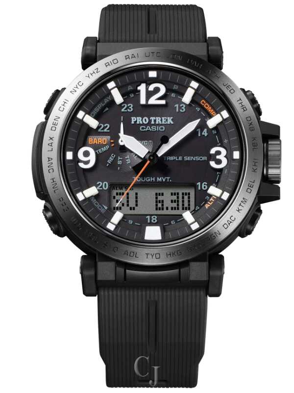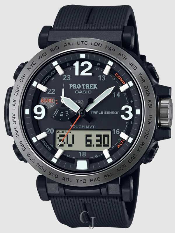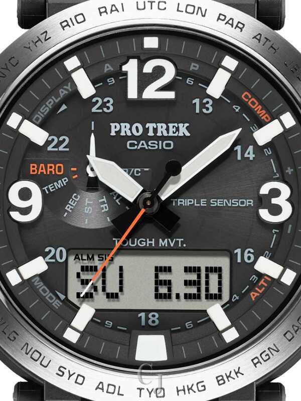 Become “One with Nature” with the new PRW6611 that uses eco-friendly materials. Biomass plastic is used for the case, band, and back cover while maintaining a comfortable fit and high visibility. Featuring a big face, large hands and indexes are place on a large-diameter dial to improve the legibility, resulting in a functionally beautiful design. The dial uses easy-to-read Arabic characters and bar indexes to improve visibility. The stainless steel bezel engraved with the city codes and has hairline finish to give the bezel a sharp look. Equipped with multi-band 6 and tough solar, PRO TREK is always in pursuit of high functionality and practicality for various scenes.