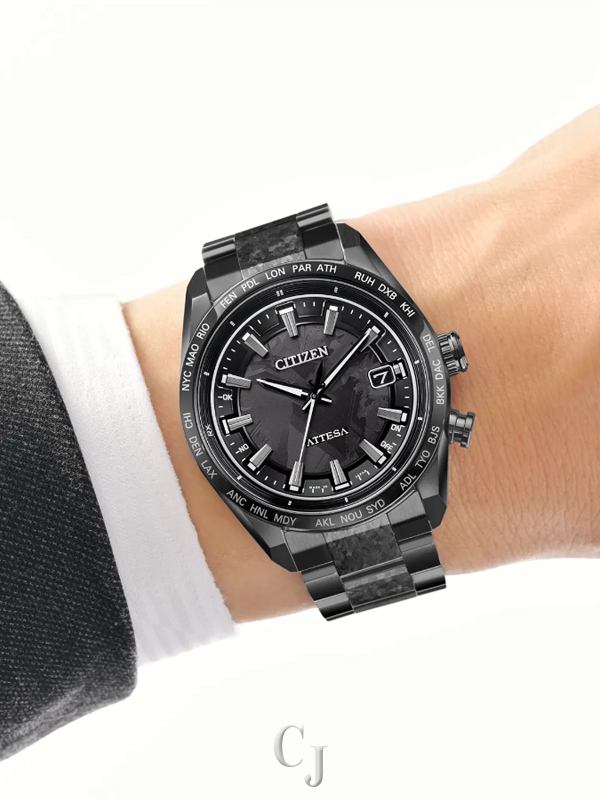 On the special detailed dial, a captivating time-and-date display is at work, with black and applied DLC accents adding dimension. Advanced features of the timepiece include world time in 26 time zones and a perpetual calendar. Featuring our sustainably light-powered Eco-Drive Atomic Timekeeping functionality, the timepiece self-adjusts to time or calendar when traveling overseas by receiving local time signals in four different regions. Water resistant up to 100 meters. Caliber H145.