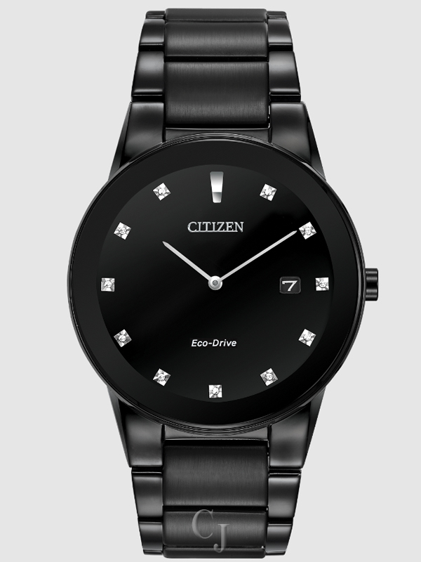 Axiom’s refined yet sleek design offers a day-to-night fashion option for the avid trendsetter. This timepiece, black ion plated stainless steel case and bracelet with black dial, features the intriguing detail of edge-to-edge glass, an 11 diamond dial and date. Featuring our Eco-Drive technology – powered by light, any light. Never needs a battery. Caliber number J165.