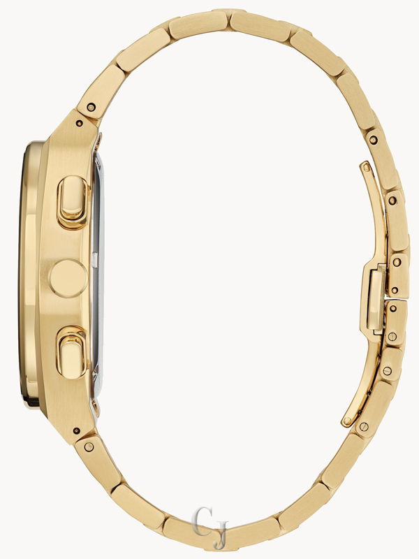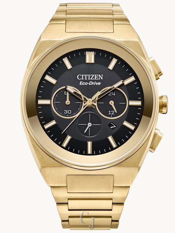 wear. The timepiece features a gold-tone stainless steel case with an integrated stainless steel bracelet, epitomizing the contemporary sports watch design. The black dial has a streamlined look with two sub-dials at 3 and 9 o’clock, outlined with silver-tone details to match the silver-tone indices and hands. Capabilities of the watch include a 1/5 second chronograph that measures up to 60 minutes, 12- and 24-hour time indication, and a date indicator. Powered by Citizen’s proprietary Eco-Drive technology to provide light-powered vitality continuously and sustainably without ever needing a battery. Caliber B620.