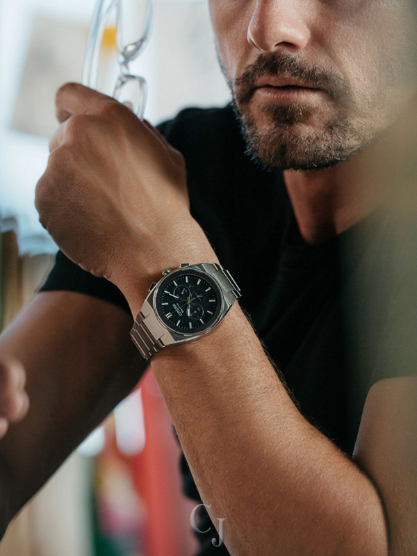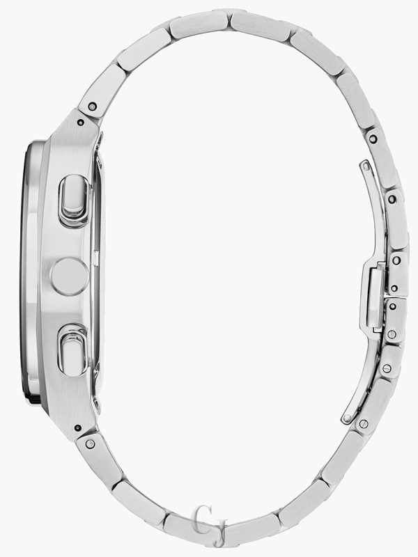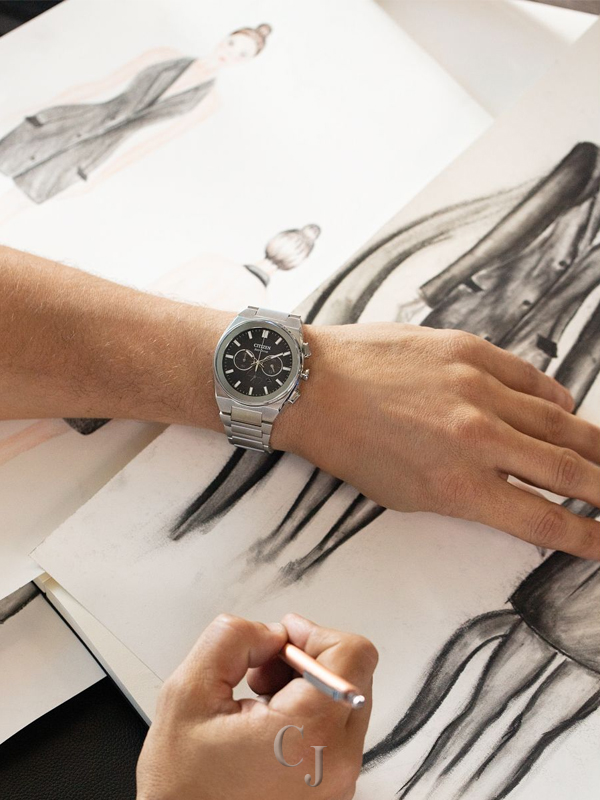The Citizen Axiom SC features a sophisticated blend of sports watch aesthetics with refined styling for the ultimate workday to weekend watch to wear. The timepiece features a silver-tone stainless steel case with an integrated stainless steel bracelet, epitomizing the contemporary sports watch design. The black dial has a streamlined look with two sub-dials at 3 and 9 o’clock, outlined with silver-tone details to match the silver-tone indices and hands. Capabilities of the watch include a 1/5 second chronograph that measures up to 60 minutes, 12- and 24-hour time indication, and a date indicator. Powered by Citizen’s proprietary Eco-Drive technology to provide light-powered vitality continuously and sustainably without ever needing a battery. Caliber B620.