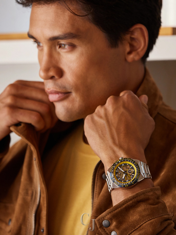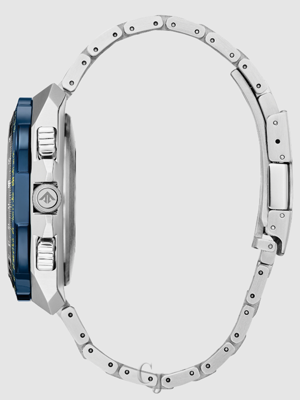 The mission of the Blue Angels is to showcase the pride and professionalism of the U.S. Navy and Marine Corps through their expert precision and dedication to excellence and service. This exceptional timepiece has a silver-tone stainless steel case with a blue ion-plated bezel, yellow inner bezel, and blue dial encased in sapphire crystal. It features atomic time clock synchronization for superior accuracy, time adjustment available in 43 world cities, a 1/100 second chronograph that measures up to 24 hours, a perpetual calendar, 2 alarms, 99-minute countdown timer, digital backlight display, Universal Coordinated Time (UTC) display, and a power reserve indicator. The silver-tone stainless steel bracelet band fastens with a fold over clasp with hidden push buttons. The Blue Angel’s insignia is replicated on the case back. This distinctive sports watch utilizes our Eco-Drive technology that’s sustainably powered by light and never needs a battery, and is water resistant up to 200 meters. Reach a higher altitude in style and pay tribute to the elite Blue Angels with this high-performance timepiece.