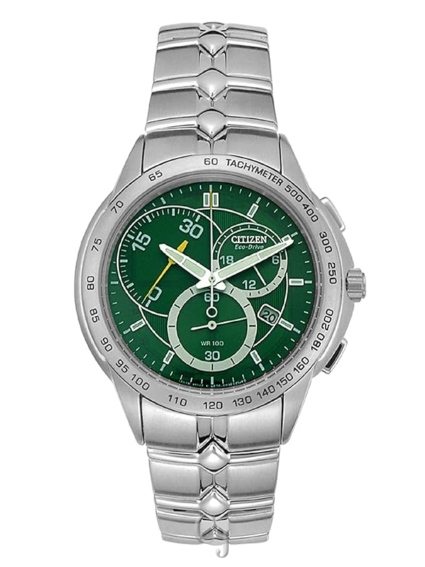 Citizen AT1060-58W Eco-Drive Calibre 5700 wrist chronograph watch with CITIZEN Rechargeable by light Eco-Drive Quartz chronograph movement. Stainless steel case with Tachymeter scale on the bezel, green color dial with date calendar, stainless steel watch band with combination of satin and polished finish, 100m water resistance.