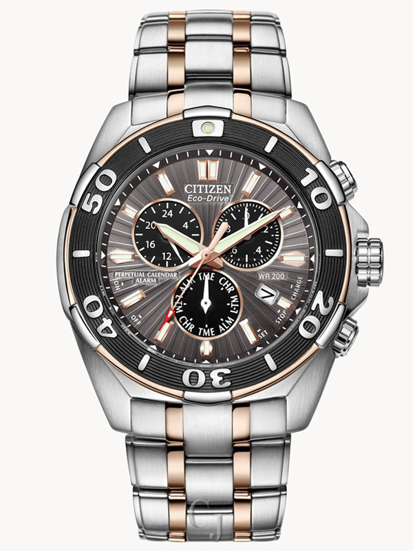 Essential functions include a perpetual calendar, 1/20 second chrono measuring up to 60 minutes, 12/24 hour time, dual time, alarm, date, one-way rotating bezel, 43mm screw-back case, 200M WR and dual-coated anti-reflective sapphire crystal. Stainless steel with rose gold-tone accents and a charcoal grey dial provide sleek sophistication. Featuring our Eco-Drive technology – powered by light, any light. Never needs a battery. Caliber number E820.