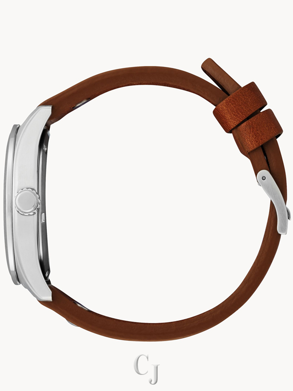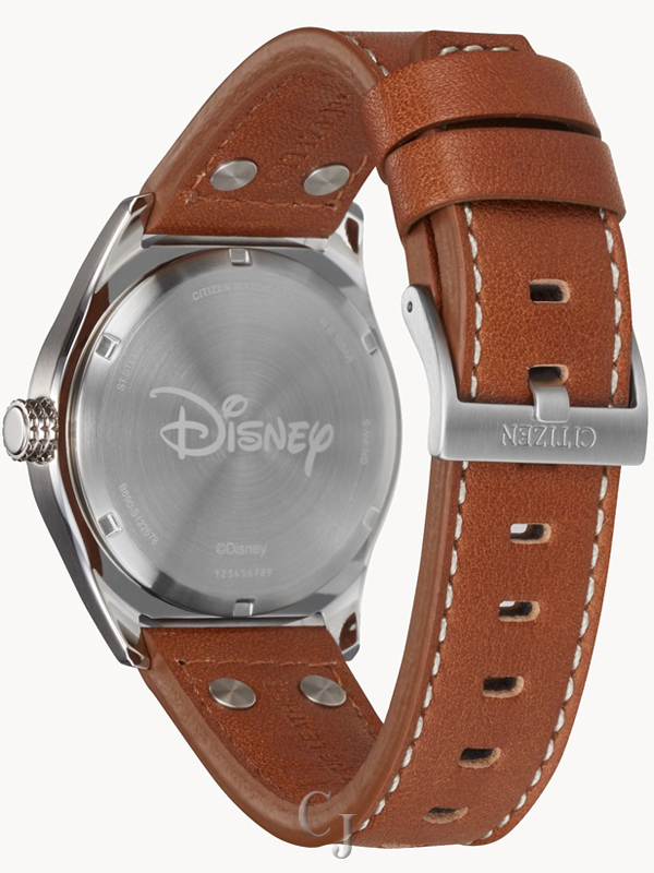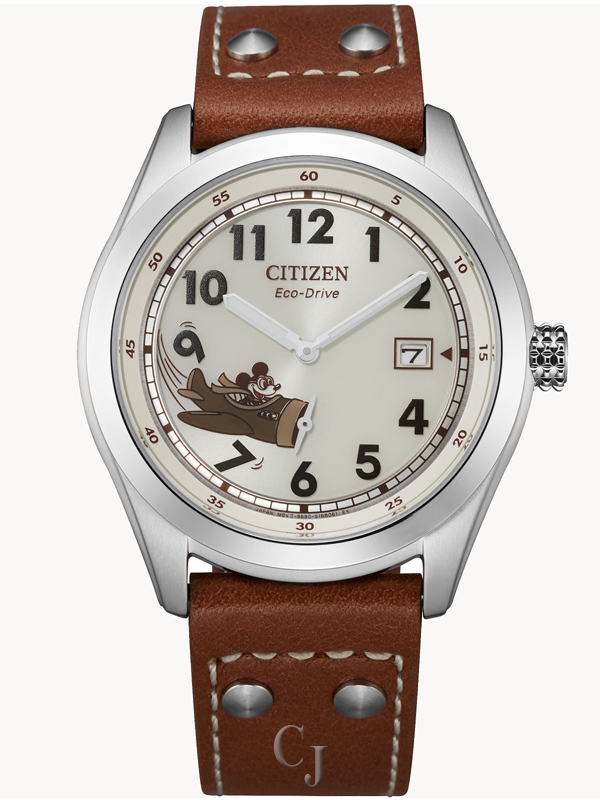 Soar to new heights wearing this vintage-inspired Disney Mickey Mouse Aviator timepiece from CITIZEN. Classic details include a tan leather strap with ivory topstitch and rivets. A stainless steel case encloses an ivory dial with exclusive artwork of Mickey Mouse flying a vintage airplane, with the propeller as the sub second hand, designed by Disney Imagineer Jeff Shelly. Citizen watches are powered by any light with Eco-Drive technology, and never need a battery. ©Disney