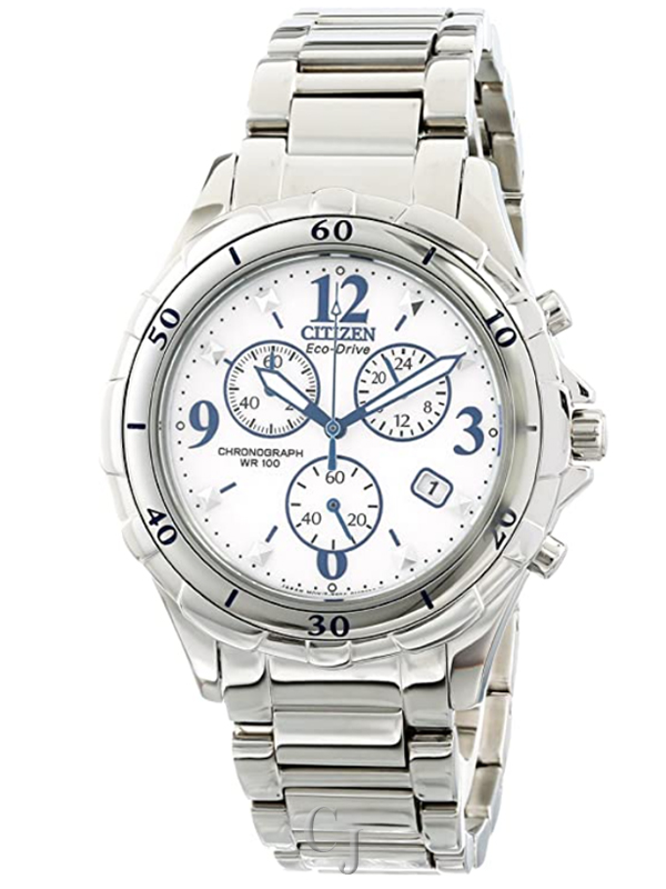 Citizen FB1350-58A Eco-Drive chronograph women’s watch features a 40mm wide and 11mm thick solid stainless steel case with a fixed bezel and textured push-pull crown with function pushers.