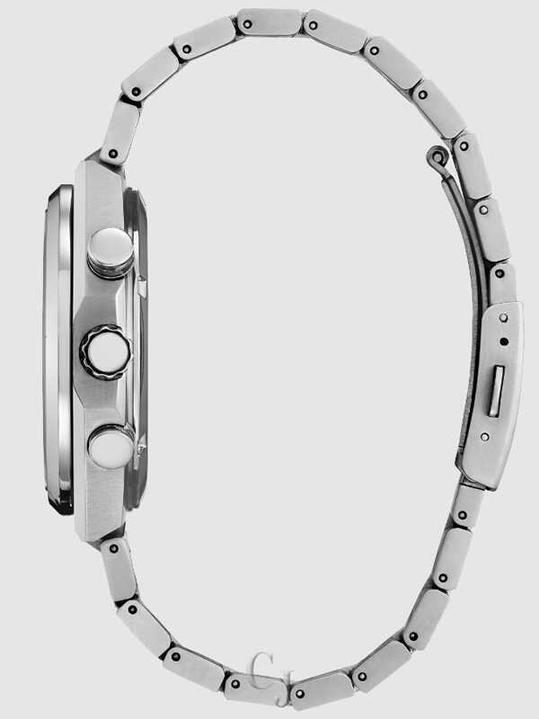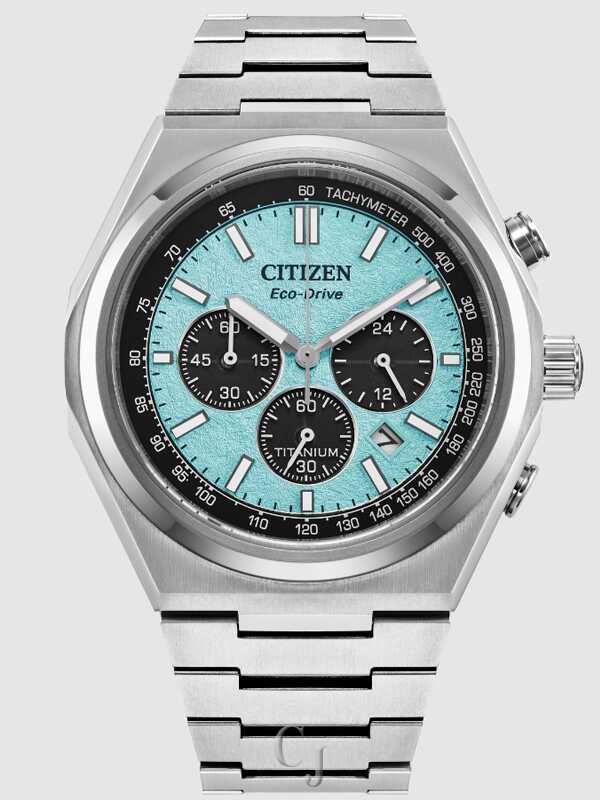 Pairing classic proportions with a distinctly modern style, meet the new Integrated Super Titanium™ series from Citizen. Featuring a 42.5mm silver-tone Super Titanium™ case paired with stylish stepped chronograph pushers and a stylized crown, the finely brushed and polished timepiece is secured to the wrist with a matching integrated bracelet. On the dial, a textured light blue color is accented with an outer tachymetric scale and triple register configuration in black, with details in silver-tone and white put to use for the handset and applied indices. Features include running time, a split-second chronograph, 12/24 hour time, and date. Sustainably powered by any light with Eco-Drive technology and never needs a battery. Water resistant to 100 meters. Caliber B620.