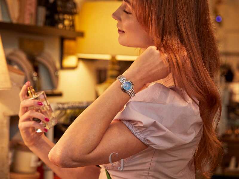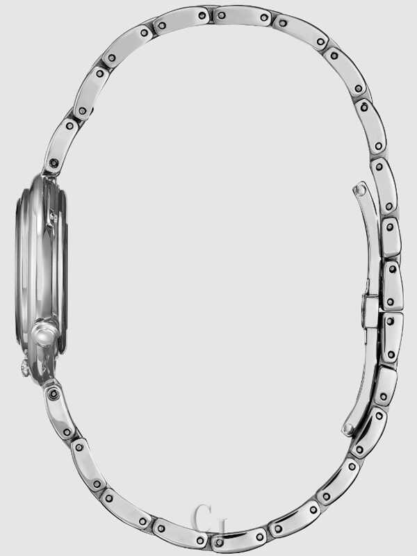 Classic lines and hints of romance make this newest piece to our women’s collection, the Citizen L Arcly, a captivating addition of sustainable luxury. With a design inspired by the original Citizen “Sunrise,” the distinctive stainless-steel timepiece is a charming accent on the wrist that’s perfect for glamorous wear. Sleek lines define the watch’s 29.8mm silhouette, with a subtle 4 o’clock crown and 7 o’clock diamond accent adding to its entrancingly delicate look. On its blue-tinged mother-of-pearl dial, applied diamond markers and sharp hands indicate the time in style atop a subtle flower motif, keeping the attention on the pure aestheticism of the timepiece. Sustainably powered by any light with our proprietary Eco-Drive technology that never needs a battery, this elegant ladies’ watch is the perfect addition to elevate any outfit. Water resistant to 50 meters. Caliber E031.
