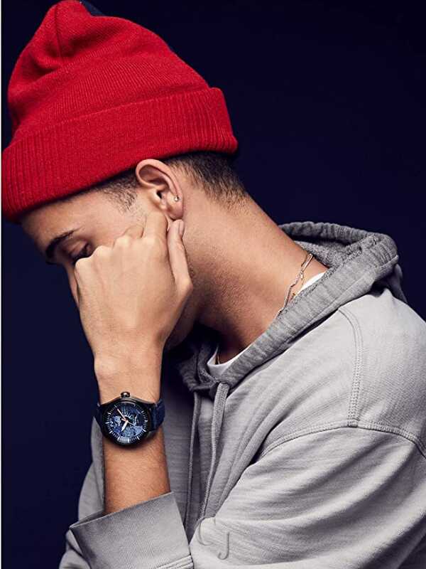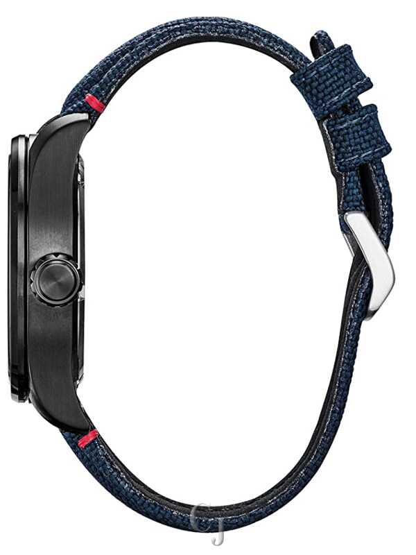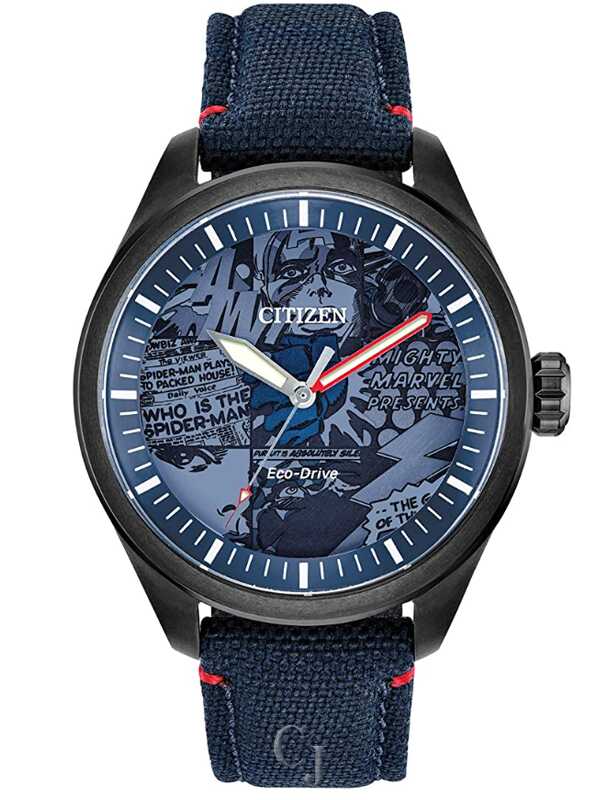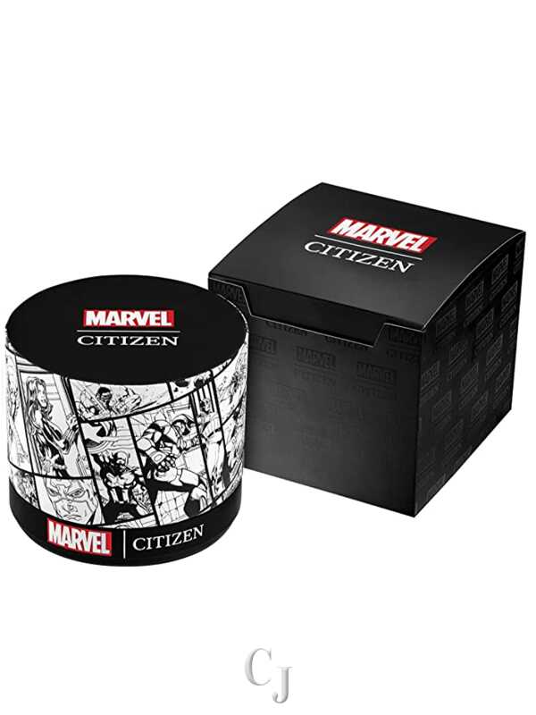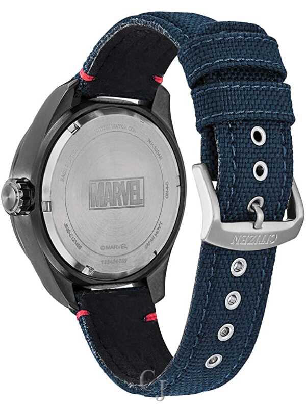 Citizen AW2037-04W Marvel Heroes men’s Eco Drive watch features a 43mm wide and 12mm thick gray ion plated solid stainless steel case with a fixed bezel and textured screw down crown. Citizen AW2037-04W is powered by Japanese J830 Eco Drive movement (Eco-Drive is fueled by light so it never needs a battery change). This stylish watch also features a textured signature comic book art printed blue dial with white accents silver tone and red luminous hands and index hour markers, scratch resistant mineral crystal and water resistant to 100 meters. Citizen AW2037-04W is equipped with a 20mm wide stitched blue Cordura fabric with a buckle clasp. Citizen AW2037-04W men’s Marvel Heroes blue strap eco drive watch is brand new and comes in an original gift box and is backed by a 5 year limited warranty.