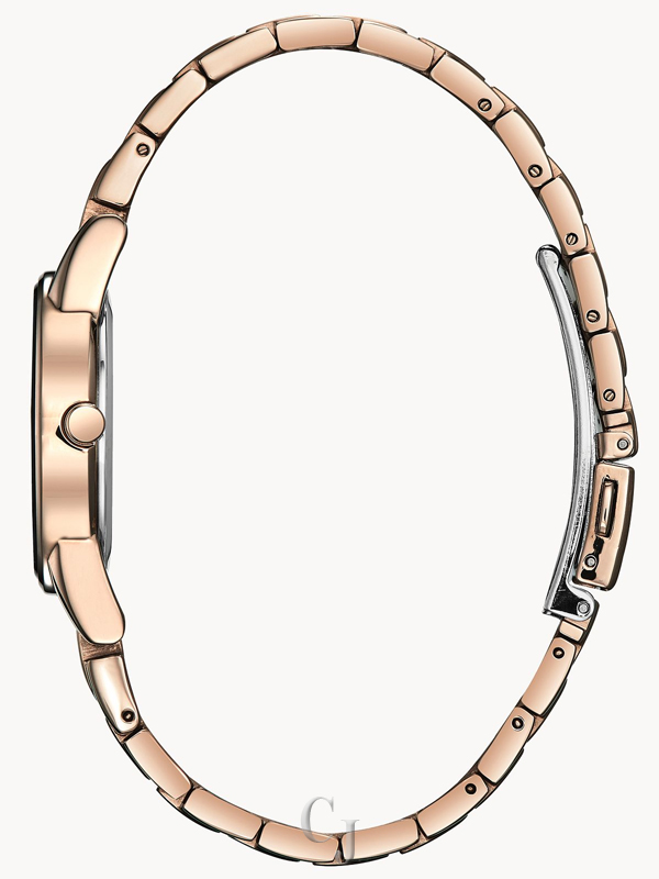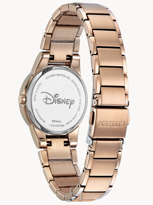 A recognizable silhouette with a recognizable mouse. The new Ladies’ Mickey Mouse timepiece by Citizen features the iconic mouse on a clean black dial with edge-to-edge glass. Showcased in a rose gold-tone stainless steel case and bracelet, black dial with diamond markers. Featuring our Eco-Drive technology – powered by light, any light. Never needs a battery. ©Disney