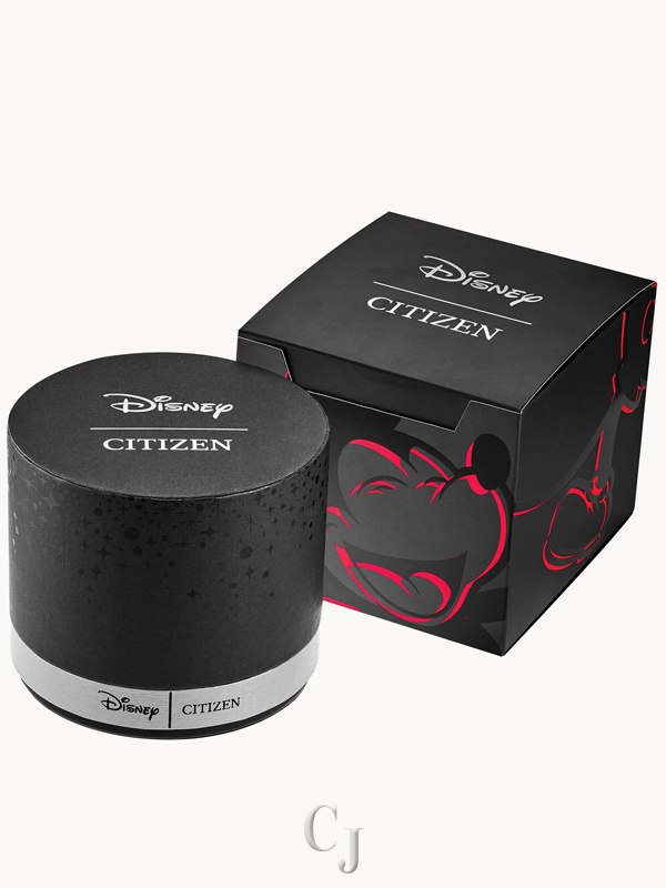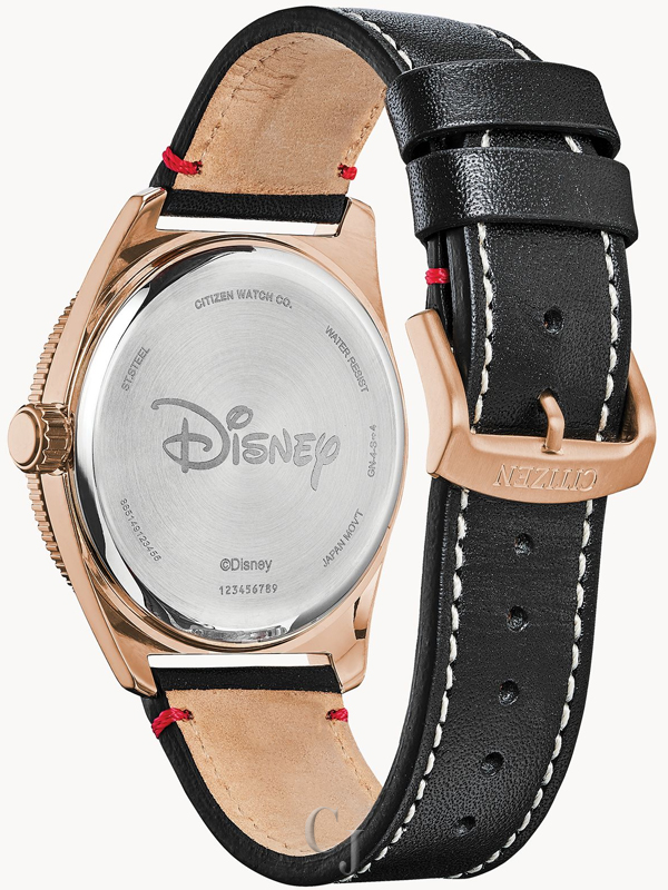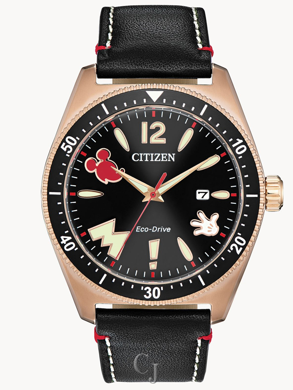 Calling all Mickey Mouse fans! This vintage-inspired Disney Mickey Mouse watch features a bright red icon accented against a black dial with date display. A rose gold-tone stainless steel case is complemented by a black leather strap with contrast stitching. Powered by light using Citizen Eco-Drive technology, it never needs a battery. ©Disney