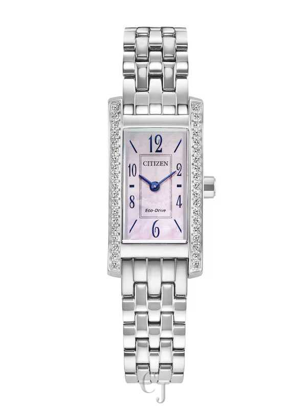 Elegant and effortlessly refined, the Citizen Palidoro EG7110-54Y is a stunning women’s timepiece that combines timeless design with modern Eco-Drive technology. Featuring a soft pink mother-of-pearl dial framed by a crystal-accented bezel, this watch shines with delicate sophistication. The rectangular 28.3mm stainless steel case is polished to a brilliant finish and paired with a matching stainless steel bracelet and secure deployment clasp. Powered by Citizen’s Eco-Drive movement, it runs on any light source and never needs a battery. With water resistance up to 30 meters and a slim, versatile profile, this watch is the perfect blend of fashion and function.