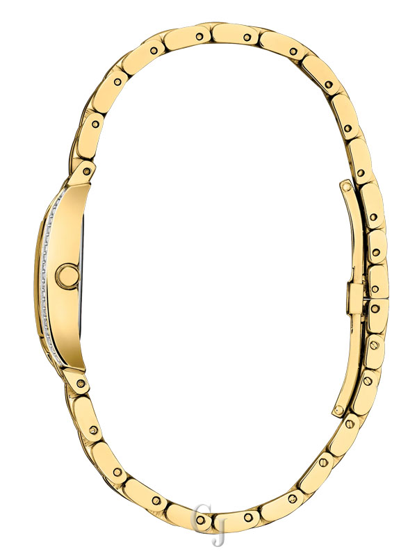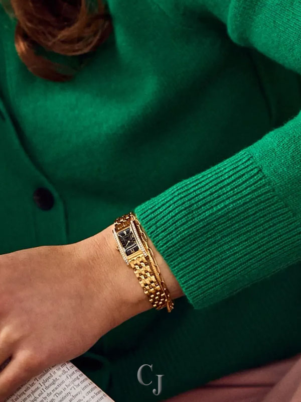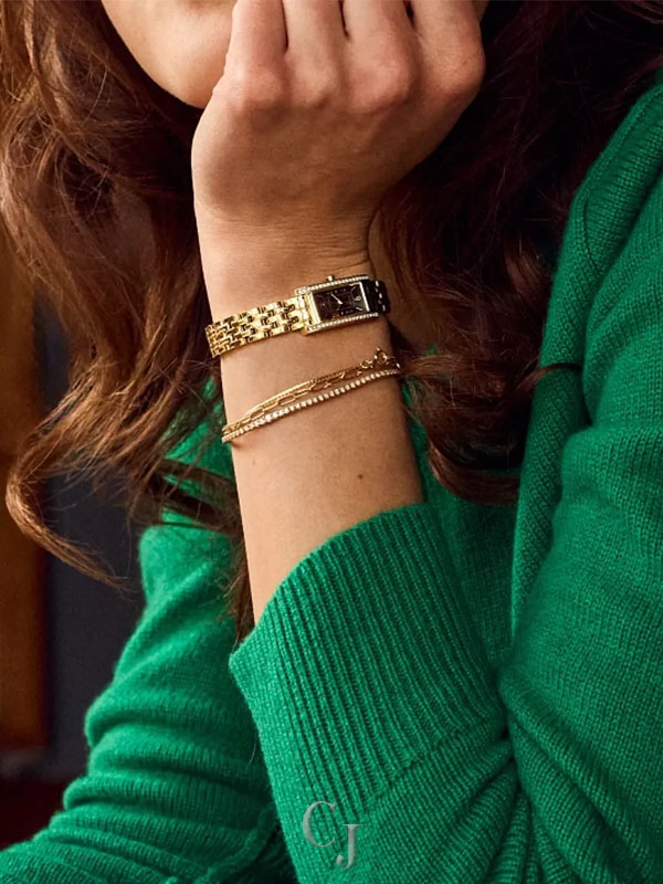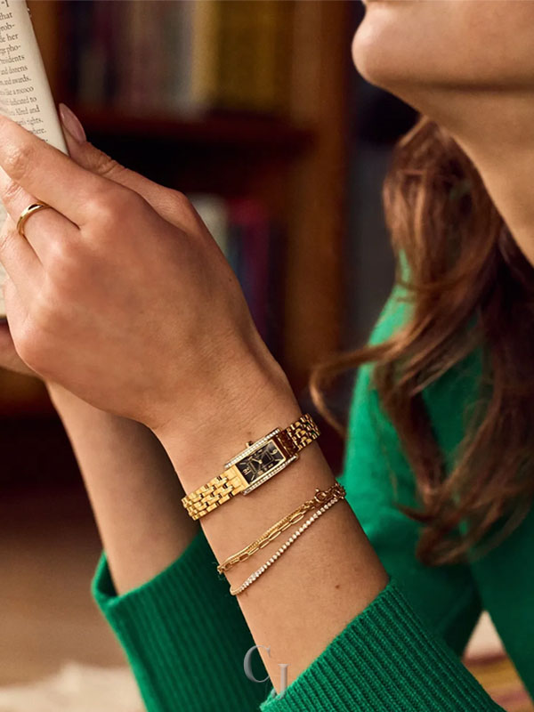 Inspired by the elegant, elongated shape of the original, the Petite Palidoro reissue is the latest women’s watch in our Dress Classic collection and is the perfect complement for elegant wear. On the wrist, the timepiece measures 28mm in gold-tone stainless steel, with its rectangular form accented by crystals on either side of the bezel and a lovely geometric crown. A matching five-link bracelet effortlessly secures the watch to the wrist.