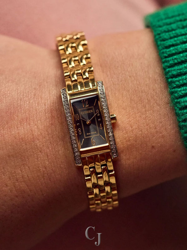The black dial is as much an exercise in sophisticated art deco as the case, with stylized Arabic numerals being framed in creative fashion while shortened hour and minute hands indicate the time. Sustainably powered by any light with our proprietary Eco-Drive technology that never needs a battery, this elegant ladies’ watch is the perfect addition to any look. Caliber G620.
