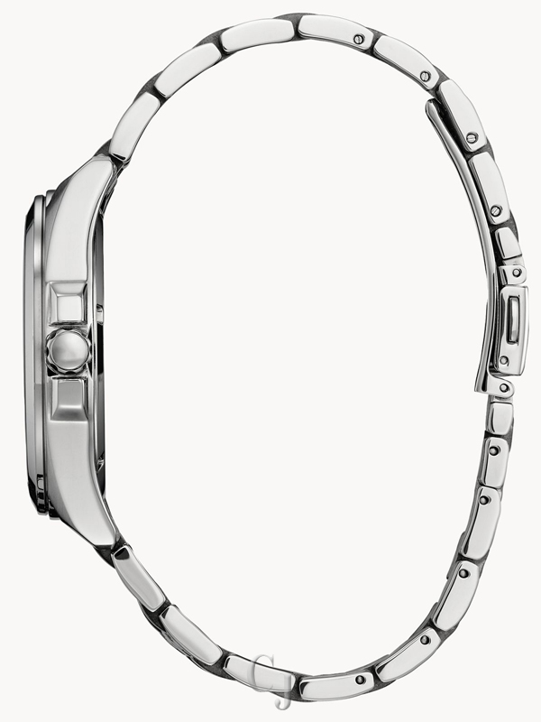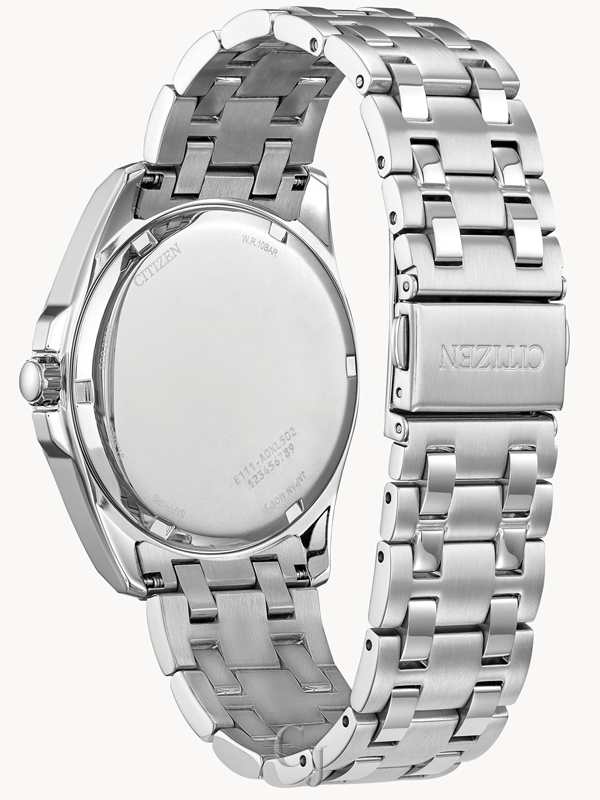 Make a distinctive style statement. Featuring a silver-tone stainless steel case and a green 3-hand dial encased in sapphire crystal, this men’s timepiece is a combination of functional simplicity with a touch of elegance. The silver-tone stainless-steel bracelet has a fold over clasp with push buttons, giving the watch an understated refinement. Water resistant to 100 meters and sustainably powered by any light with Eco-Drive that never needs a battery.