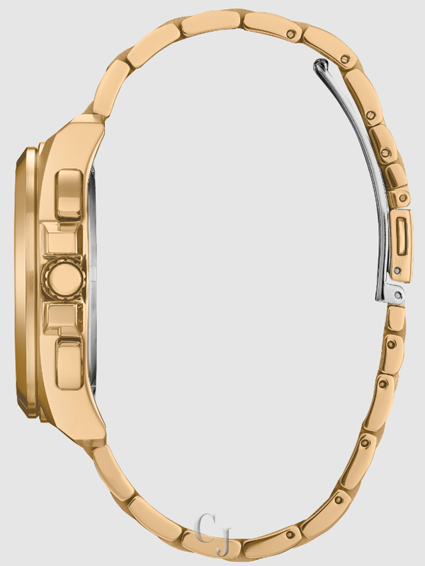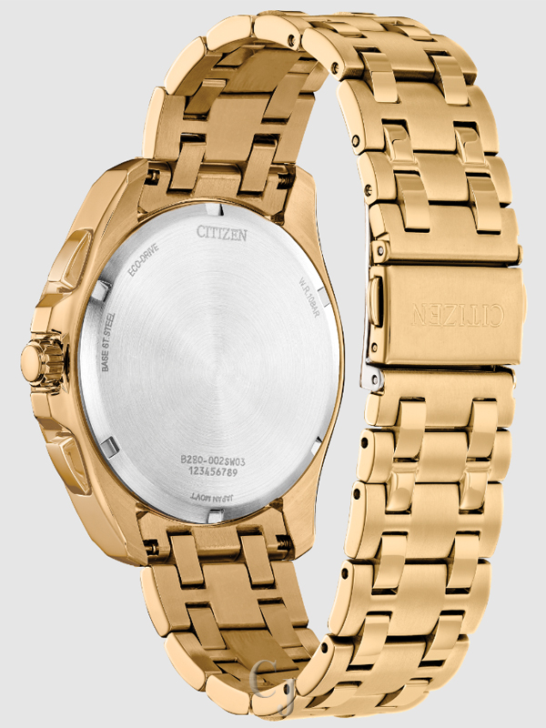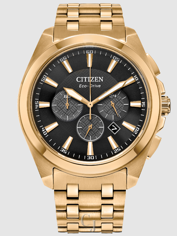 Make a distinctive style statement with the new Citizen men’s dress watch from the Classic collection. The gold-tone stainless steel case holds the black dial with a 1/5 second chronograph that measures up to 60 minutes, 12/24-hour, time and date. The sleek dial is encased is finished with a sapphire crystal. The gold-tone stainless steel bracelet has a fold over clasp with push buttons, giving the timepiece an understated refinement. This Eco-Drive watch is sustainably powered by any light source, eliminating the need for batteries, and is water resistant up to 100 meters. This professional-looking timepiece provides the wearer with lasting style and top performance.