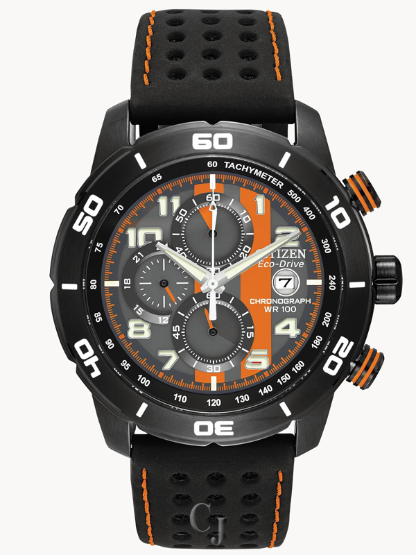 Adrenaline is at full throttle with this race-inspired watch. Lead the field in fashion with this sporty, 1/5 second chronograph powered by Eco-Drive technology. The stainless steel grey ion-plated case, accompanied by a soft-touch strap backed with bold orange nylon, will keep you on the fast track to style. Featuring our Eco-Drive technology – powered by light, any light. Never needs a battery. Caliber number B612.
