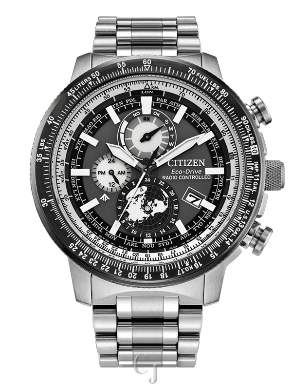 Touch the edge of the sky with the new Promaster Air Geo Trekker, featuring global Radio Control timekeeping for exceptional accuracy. A striking 46mm stainless steel case in silver-tone centers the design, with the professional-grade pilot’s watch mission-ready on the wrist – fully equipped with a bold set of chronograph pushers, 5-link stainless steel bracelet, and an outer slide rule bezel.