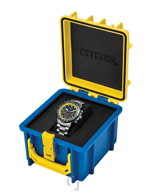 On the wrist, the watch’s silver-tone stainless steel case measures 40mm in diameter, wearing boldly with its sharp faceting and satin finishing, while a slide-rule scale on the blue ion-plated bidirectional bezel provides additional flight utility. A triple-link stainless steel bracelet secures the timepiece. On the dial, a Blue Angels colorway with black and white accents adds to the watch’s superior legibility, while a sapphire crystal and 200m of water resistance protect it all. Functions include a 1/5 second chronograph measuring up to 60 minutes, 12/24 hour time displays, and a date indicator. The movement is protected via a Blue Angels’ insignia-signed case back, and is powered by Citizen’s Eco-Drive technology – sustainably powered by light and never needing a battery. Caliber B620.