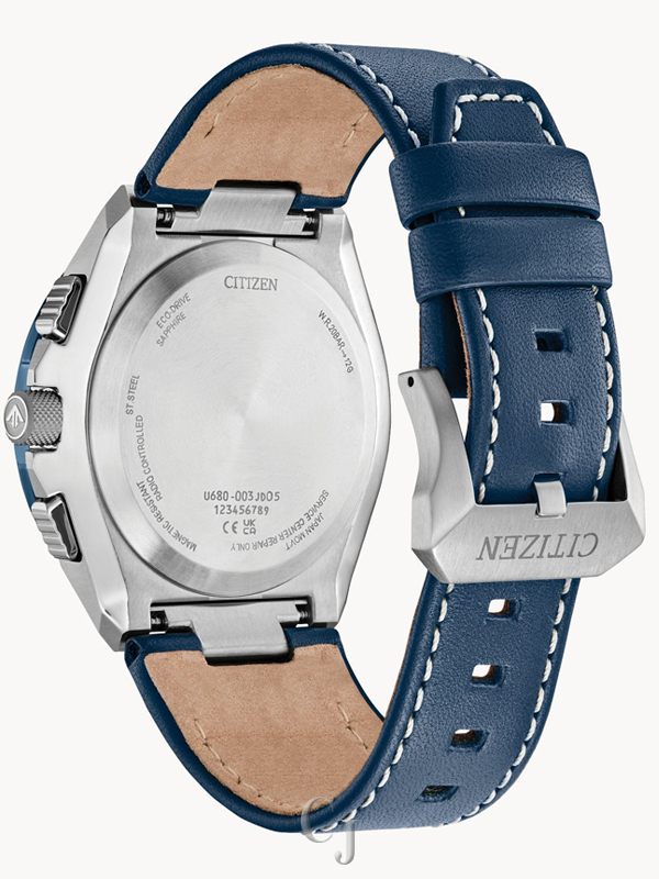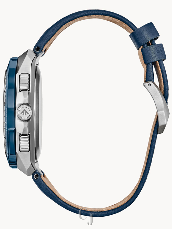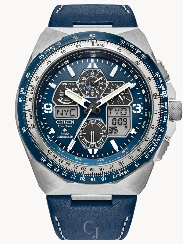 Reach a higher altitude in style and performance with the new Promaster Skyhawk A-T. This must-have chronograph features a silver-tone stainless steel case and an entrancing blue dial, with its bold 46mm shape secured to the wrist via a matching blue leather strap. Underneath a scratch-resistant sapphire crystal, the watch’s azure display is on view, with white and silver-tone accents working in tandem with analog and digital components for the unique Skyhawk’s unique aesthetic and technical capabilities. The advanced functions of the watch include atomic time clock synchronization for superior accuracy, time adjustment available in 43 world cities, 1/100 second chronograph measures up to 24 hours, perpetual calendar, GMT dual time (second time zone), 2 alarms, 99-minute countdown timer, digital backlight display, Universal Coordinated Time (UTC) display, and a power reserve indicator. This distinctive sports watch utilizes Citizen’s Eco-Drive technology that’s sustainably powered by any light and never needs a battery. Water resistant up to 200 meters. Caliber U680.