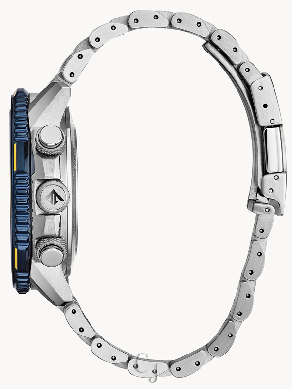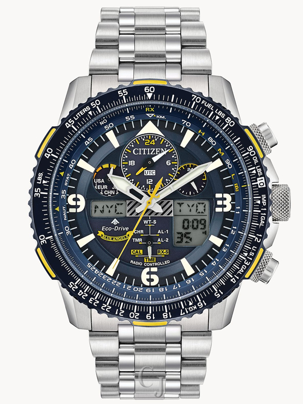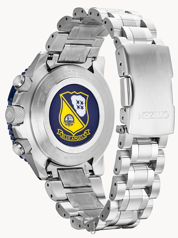 The Blue Angels are the Navy’s elite flight demonstration squadron renowned for their precision and grace showcased in each of their flight maneuvers. This precision and grace is exhibited in the CITIZEN Promaster Blue Angels Skyhawk A-T with precise atomic timekeeping in 43 cities. Other features include a chronograph, perpetual calendar, dual time, alarms, countdown timer, digital backlight and UTC display, power reserve and pilot’s rotating slide rule bezel. This model appears in a stainless steel case and bracelet, yellow accented dark blue dial and bezel with the Blue Angel’s insignia replicated on the caseback. Featuring our Eco-Drive technology – powered by light, any light. Never needs a battery. Caliber number U680.