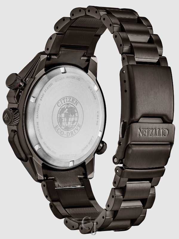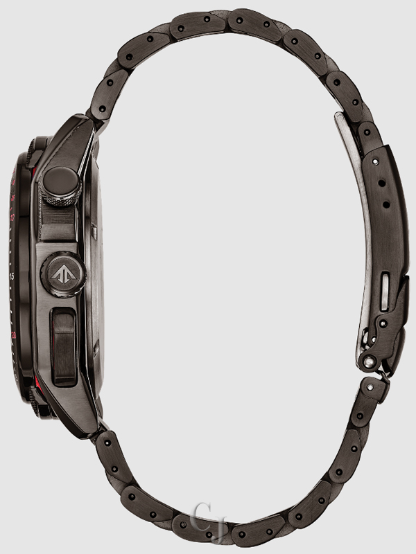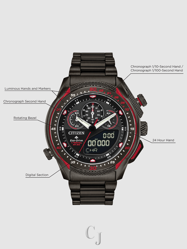 Driver beware, one look at redesigned CITIZEN Promaster SST (Split Second Timer) and you’re staring into the dashboard of your timekeeping thrill ride. This timepiece features a world time, 1/1000 second chronograph, recall of up to 20 lap times, ani/digi display, 99-minute countdown timer, average speed calculator and month/day/date. Featured in a gray ion plated stainless steel, black ion plated bezel and black dial with complimentary red accents. Featuring our Eco-Drive technology – powered by light, any light. Never needs a battery. Caliber number U700.