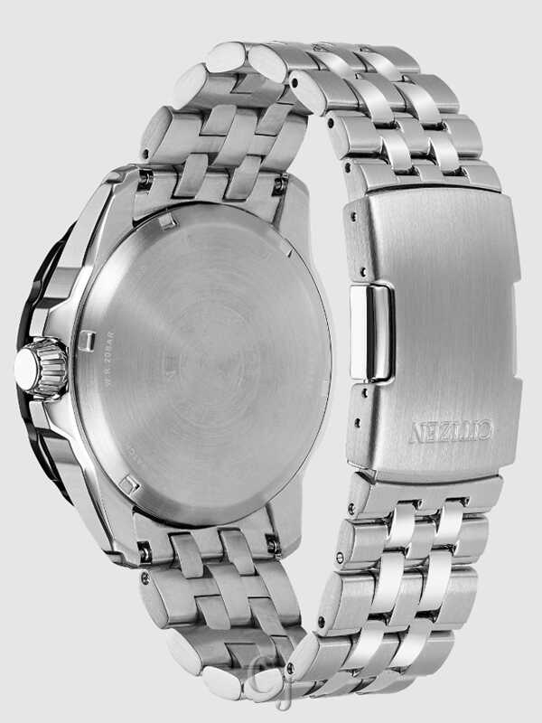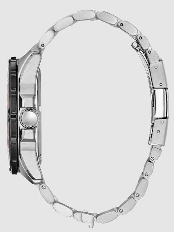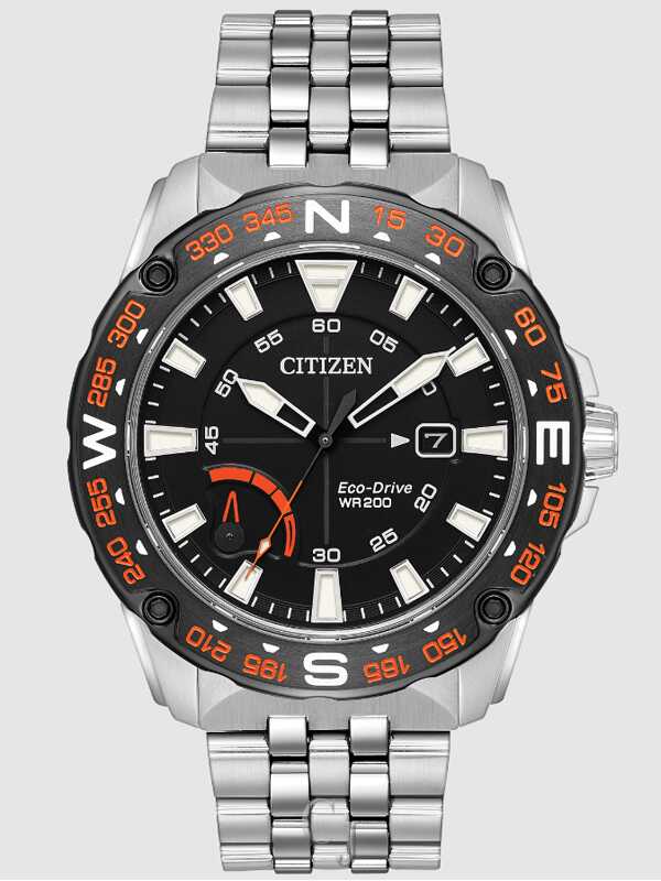 A sport style with bold detailing at an affordable price, the CITIZEN PRT model truly represents the every day watch. Powered by any light with Eco-Drive, this model is displayed with a stainless steel case and bracelet, black ion-plated bezel and bold black dial with bright orange accents. Featuring power reserve indicator and date. Featuring our Eco-Drive technology – powered by light, any light. Never needs a battery. Caliber number J850.