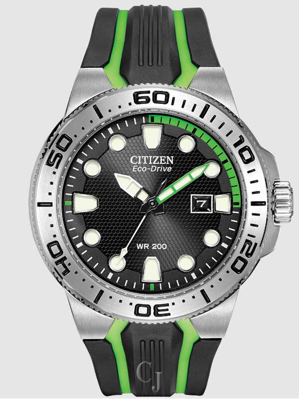 Citizen Eco-Drive Scuba Fin is a perfect choice for divers as well as active sports consumers. Features include a one-way rotating elapsed-time bezel, 46mm screw-back case and screw-down crown, 200M WR, and luminous hands and markers. Shown in stainless steel with black poly strap with buckle and bold green accents. Featuring our Eco-Drive technology – powered by light, any light. Never needs a battery. Caliber number E168.