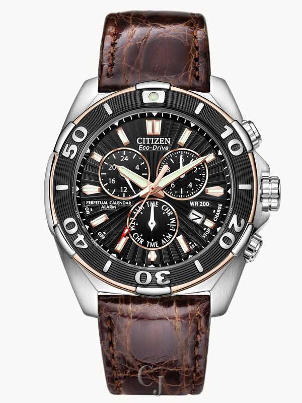 Essential functions include a perpetual calendar, 1/20 second chrono measuring up to 60 minutes, 12/24 hour time, dual time, alarm, date, one-way rotating bezel, 43mm screw-back case, 200M WR and dual-coated anti-reflective sapphire crystal. Stainless steel with a black bezel and dial and brown crocodile strap provide a richness to the design. Featuring our Eco-Drive technology – powered by light, any light. Never needs a battery. Caliber number E820.