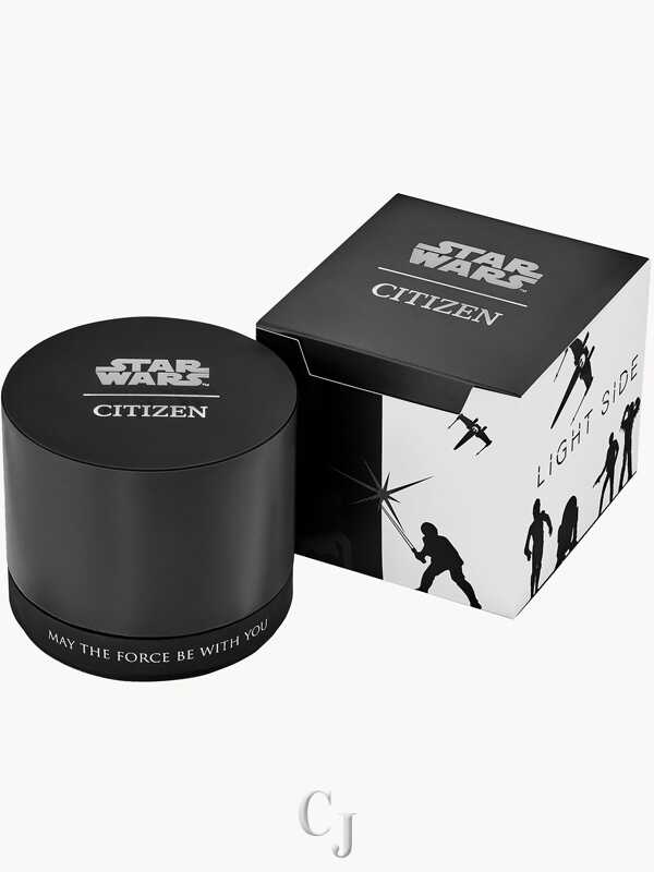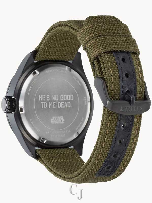 The Star Wars™ Boba Fett timepiece from CITIZEN is inspired by the feared bounty hunter’s rugged Mandalorian armor. A black ion-plated stainless steel case is complemented by an olive green Cordura® fabric strap with ribbed texture. The black dial features deep red accents and beige Arabic markers in a distressed print. This field watch features a 12/24-hour time, day and date. The Fett clan’s crest and the Mythosaur Skull symbol, representing Mandalorians, appears on the sub-dials. The case back is etched with Boba Fett’s quote, “He’s no good to me dead.” Powered by Eco-Drive technology, this Star Wars watch never needs a battery.
