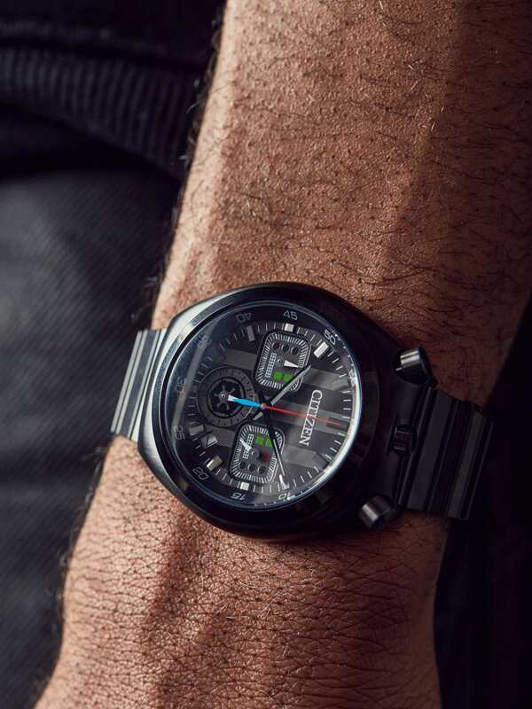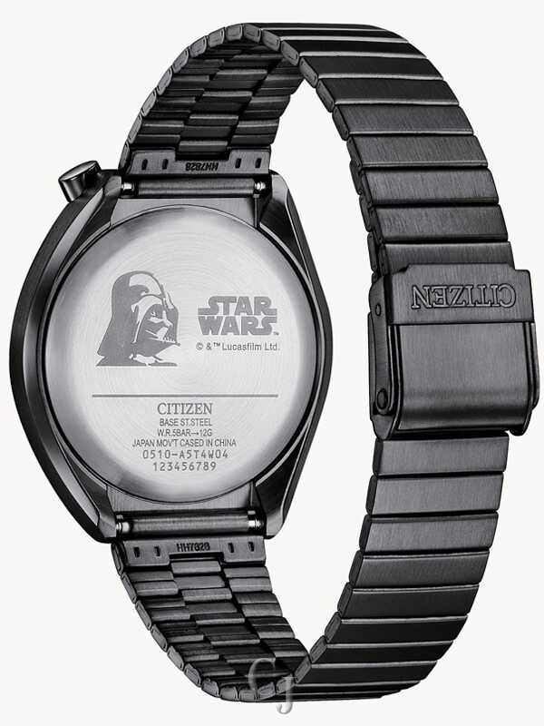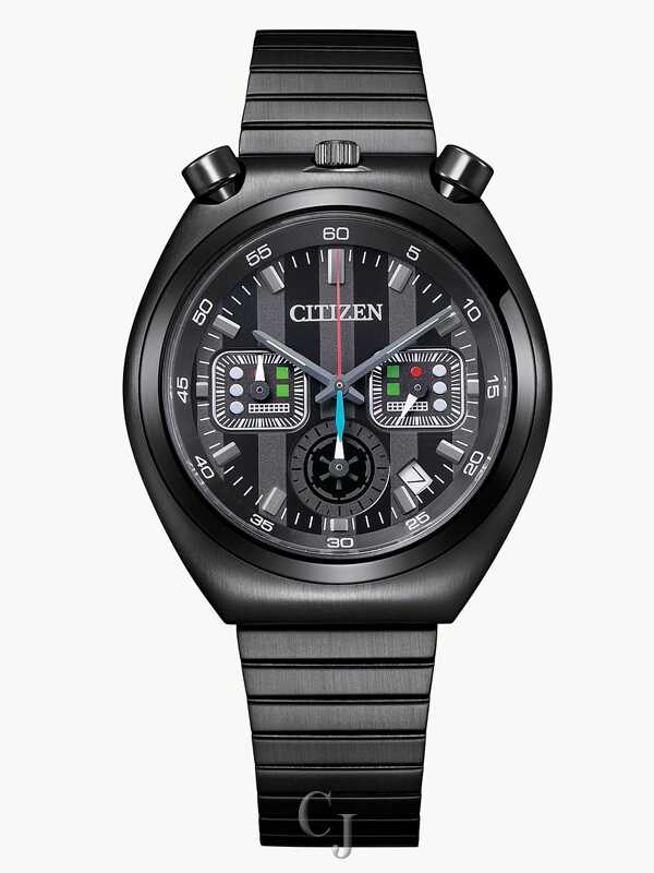 You’re in command with the Darth Vader-inspired timepiece, part of the Star Wars™ | Citizen Tsuno Collection. The detailed design evokes the powerful authority of Darth Vader’s presence – the colors of the chronograph hands echo his transformation from Jedi™ to Sith™, and the sub-dials feature green and red design elements inspired by his iconic armor. A black ion-plated stainless steel case and bracelet perfectly complement the black brass dial that features the date near 5 o’clock. The case back is etched with the Darth Vader character and classic Star Wars logo. This exciting collection features 4 timepieces in all, each with a vintage design inspired by Citizen’s famed 1972 model known as the Tsuno Chrono, thanks to tsuno “horns” placed on both sides of the 12 o’clock position. This watch requires a battery. Caliber number 0510.