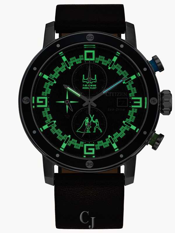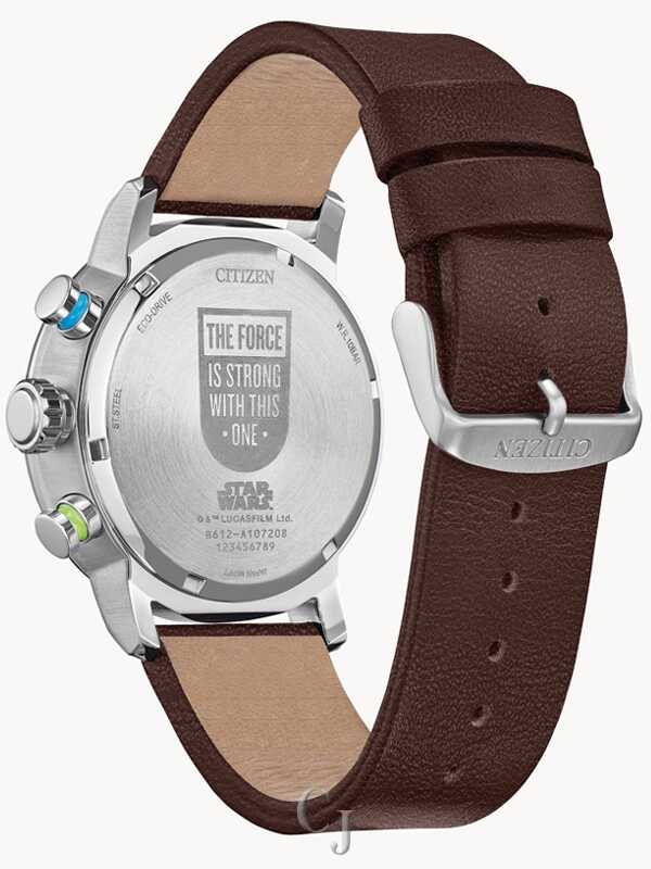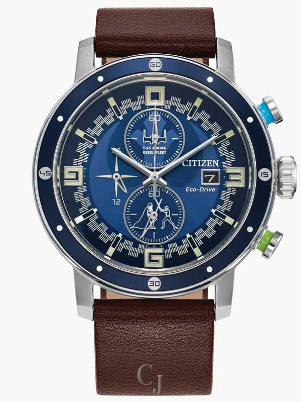 Represent the light side with the Star Wars™ Luke Skywalker™ timepiece from Citizen. Inspired by the daring adventures of the humble farm boy from Tatooine, the fight-ready watch is driven by Citizen’s proprietary Eco-Drive technology to provide light-powered vitality without ever needing a battery. A silver-tone stainless steel case with a blue aluminum bezel serves as the canvas for the design, complemented by blue and green accented chronograph pushers representing the colors of Skywalker’s lightsabers. On the dial, a sectored blue style features an inner motif of the symbol of the Rebel Alliance, while an image of Skywalker’s X-wing and a scene of his iconic struggle with Darth Vader mark the top and bottom sub-dials. The watch is presented on a brown leather strap, giving a soft detail to an otherwise robust design and providing an elegant touch to the bold chronograph.