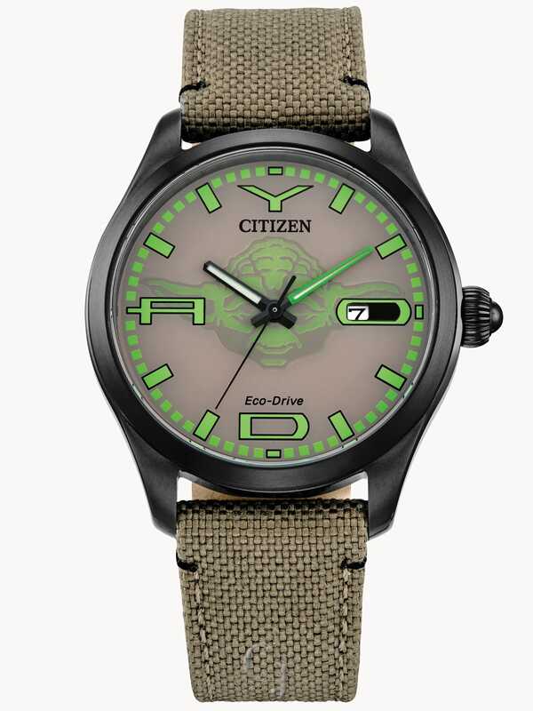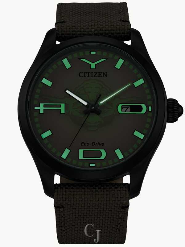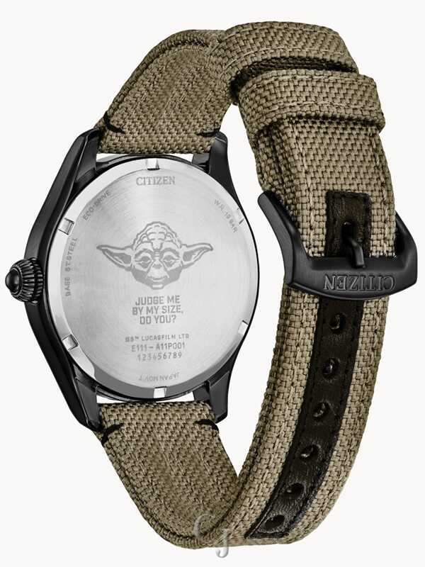 Get galactic with the power and precision of the Yoda™-themed Citizen timepiece on your wrist. Part of the Star Wars™ | Citizen collection, this striking watch is powered by Eco-Drive technology, so you’ll never need a battery. Featuring a bold, black ion-plated stainless steel case with 3-hand dial and date display, the subtle, sand-colored dial is offset with luminous hands and markers that spell Y-o-d-a, ensuring you’ll always have the wisdom to ally with the light side. The water-resistant case is etched on the back with the likeness of Yoda and his classic quote, “Judge me by my size, do you?” Paired with a Cordura nylon strap that’s as resilient as Yoda himself. Caliber number E111.