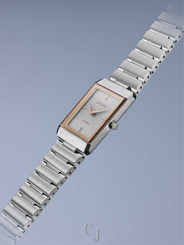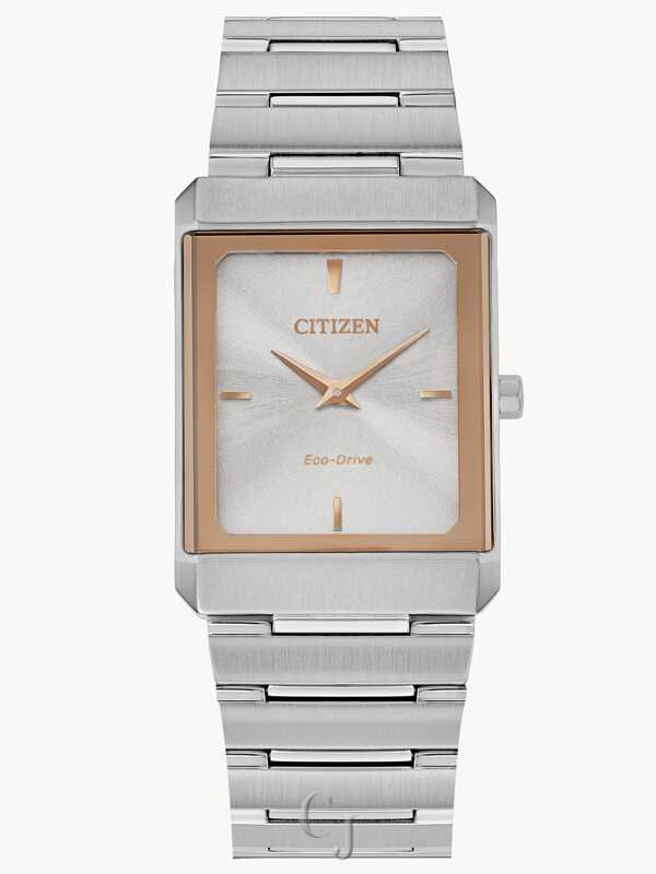 The delicate small Stiletto from Citizen is the perfect unisex watch that complements every style. The stainless steel bracelet-style band is accented by a rose gold two-tone square case and silver face, with a silver-tone dial. The Eco-Drive equipped timepiece is powered by light, and is just 5.06mm (+/- .25mm) thick, giving it an incredibly slim profile.