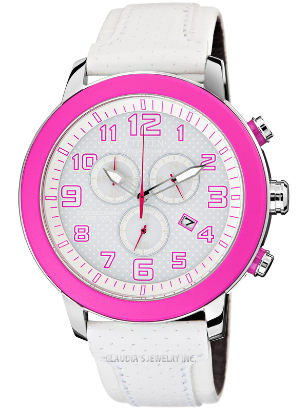 Citizen Eco-Drive technology harnesses the power of light – from any natural or artificial light source and converts it into energy which is stored in a permanently rechargeable lithium-ion cell. It recharges continuously in any kind of light to run forever. Sleek white with a pop of bright pink gives this chronograph a fresh, modern edge. Additional features include a 1-second chronograph which measures up to 60 minutes, 12/24 hour time, date feature and water resistance to 100 meters.